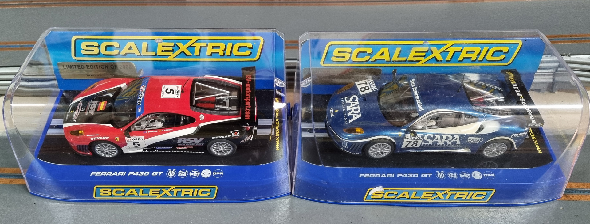 2x Scalextric F430, the white on the "Sara" car does look to have discoloured a little from age, I would like £35 each or the pair for £60