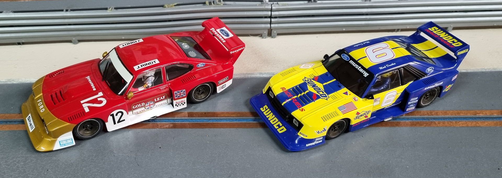 Sideways Group 5 Mustang and Capri. Mostly stock apart from wheels and inserts, tyres and guides. £60 the pair.