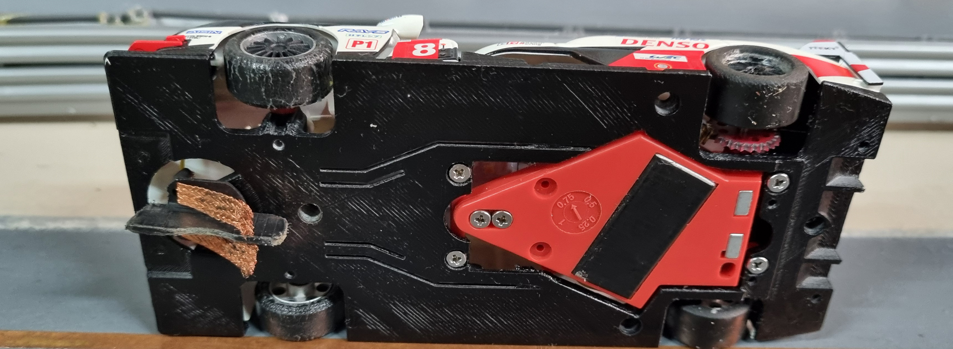 SRC Toyota LMP. 3dp KAT chassis, Scaleauto AW pod, slot it gears, aluminium wheels, air hub rears, I think the motor is a Scaleauto SC-0029 22.5k, wood guide.
