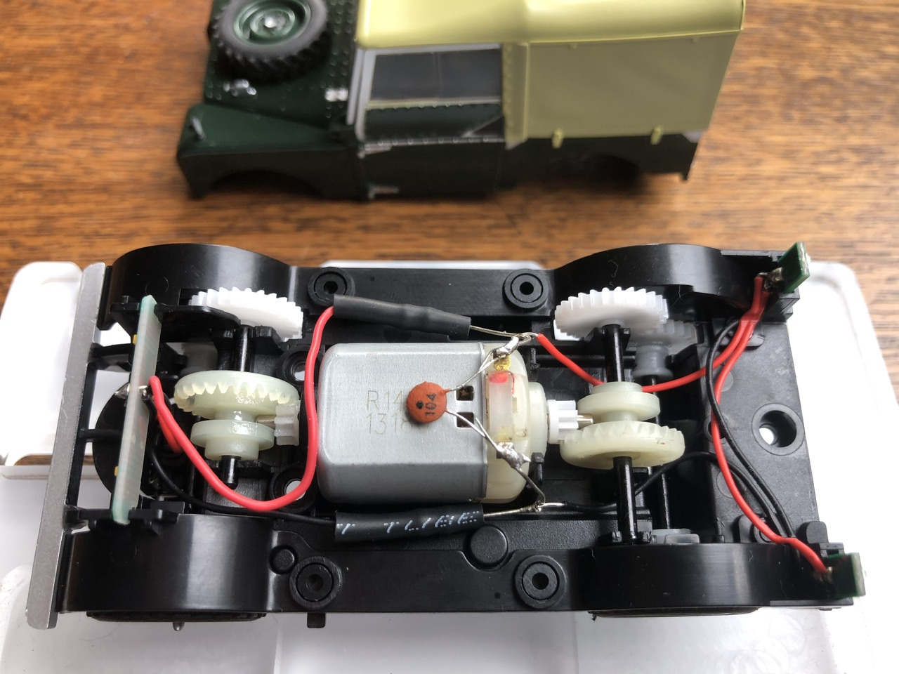 Interestingly, by swapping in a standard Scalextric Mabuchi motor the four-wheel drive could be disengaged. Will that make an observable difference? for example when crossing lanes etc? Let’s see.