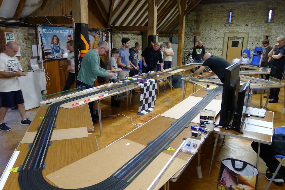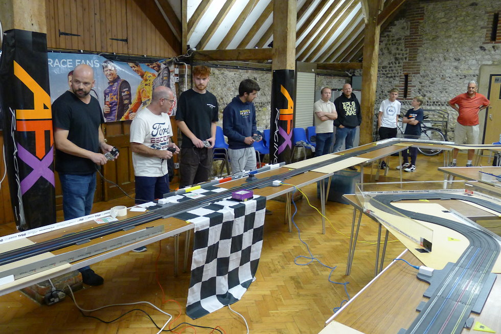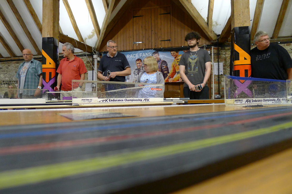 In his last race before heading off to uni, Alex had finally settled on a car which seemed okay-ish. He'd use every F1 model in the Ferrigno pit box during the heats and had a difficult time, qualifying last. Alex made his debut at the Barn when he was a similar age to Frankie - and it was the latest WHO youngster who was first round to lead the opening lap. A brief off for Frankie on lap 2 let Gary through and his Super-G looked to have the better of the Mega-G+ field...