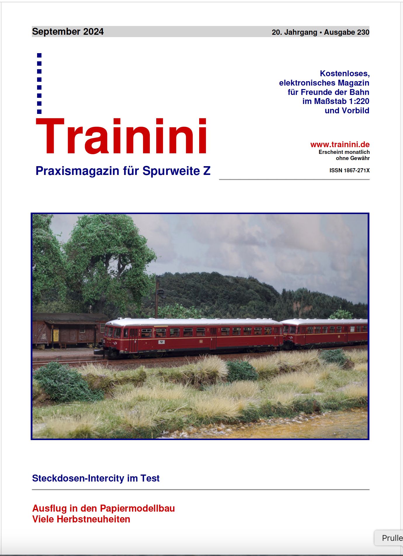 The new free 70 page, issue number 230, September 2024 Trainini magazine for 1:220 scale (Z scale) model trains is available now.