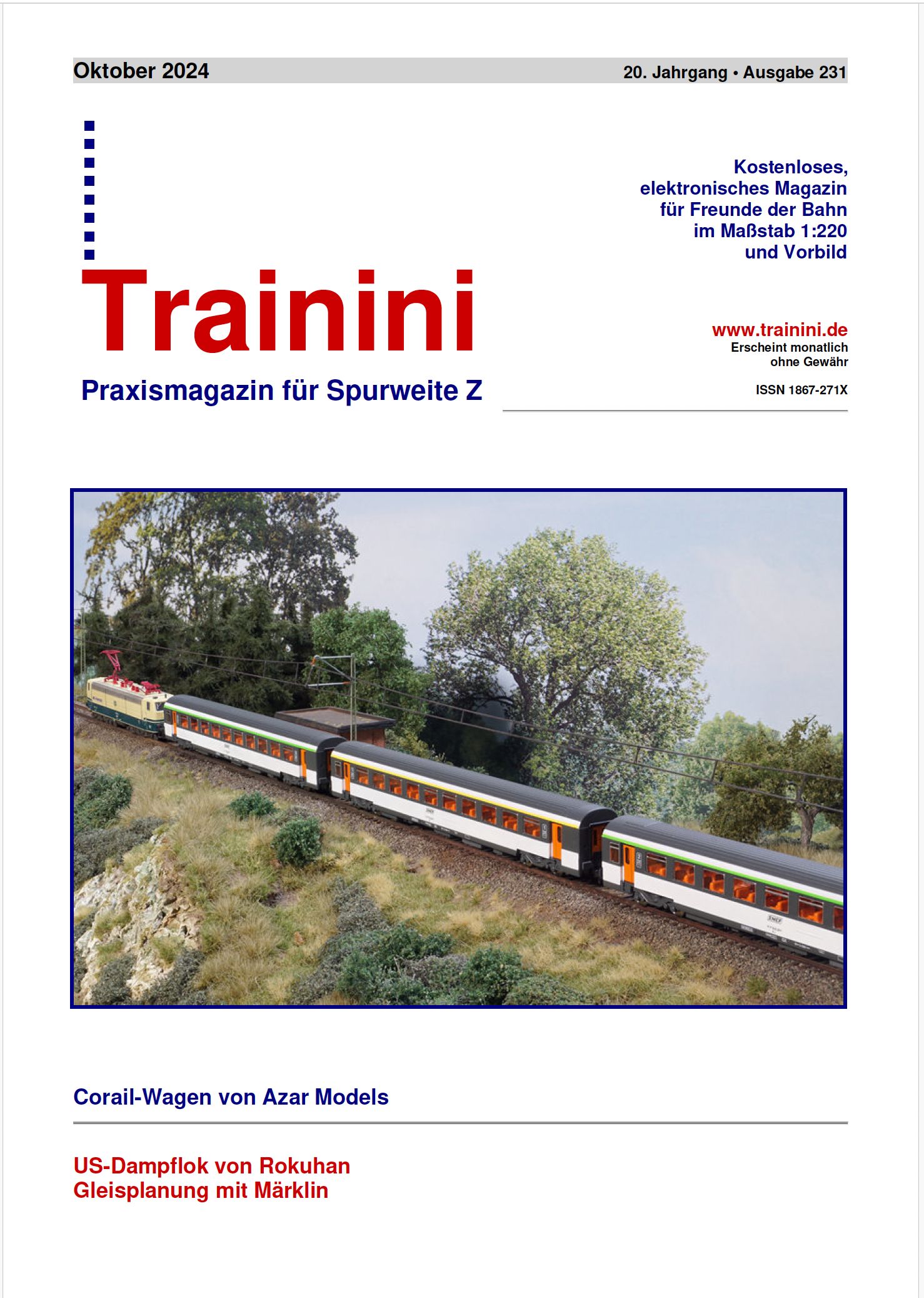 The new free 68 page, issue number 231, October 2024 Trainini magazine for 1:220 scale (Z scale) model trains is available now.
