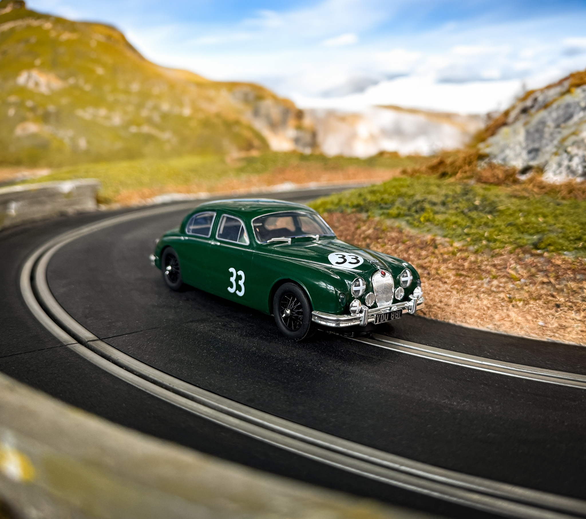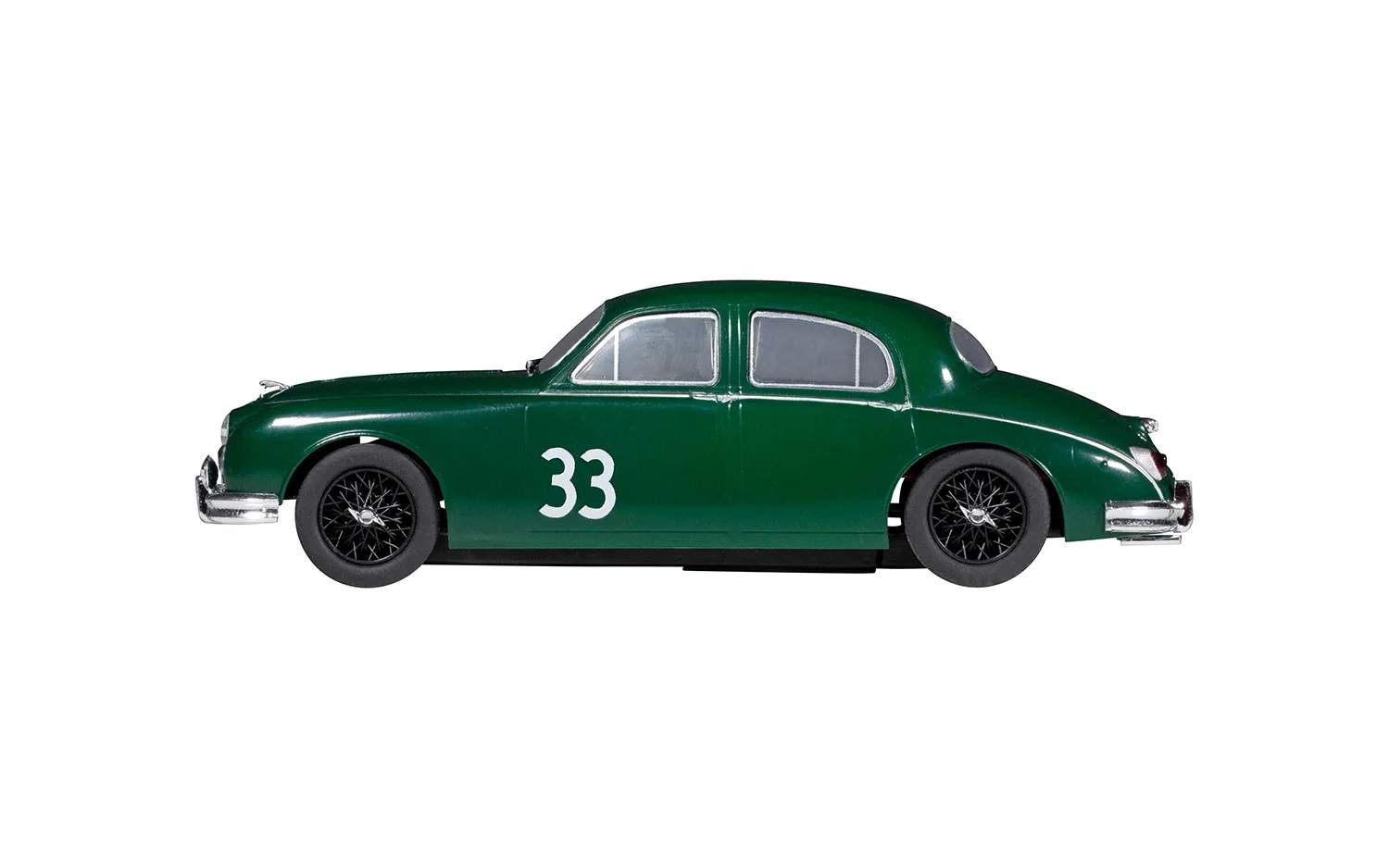 Scalextric have done a good job with the Morse Jag. I saw a sample at the Gaugesmaster event last month and I was impressed. All my gripes about the the Mk1 racing version (no quarter lights, ill-defined central door pillar) have been put right with this one. Some extra tooling, great detail and the wheels are fabulous. £56 though...