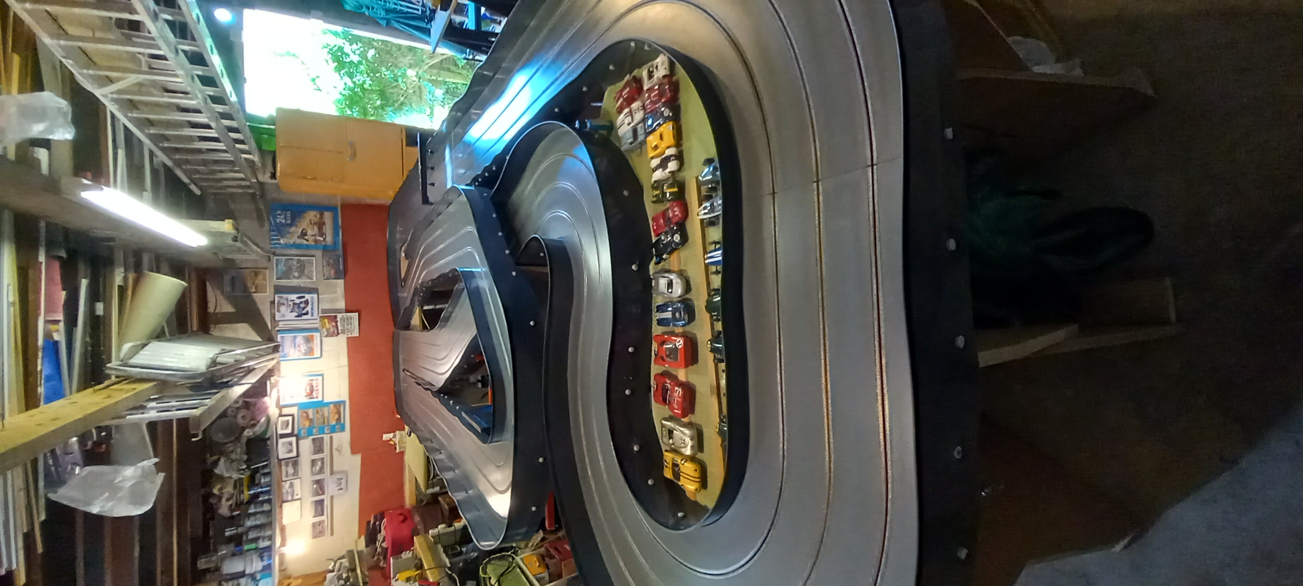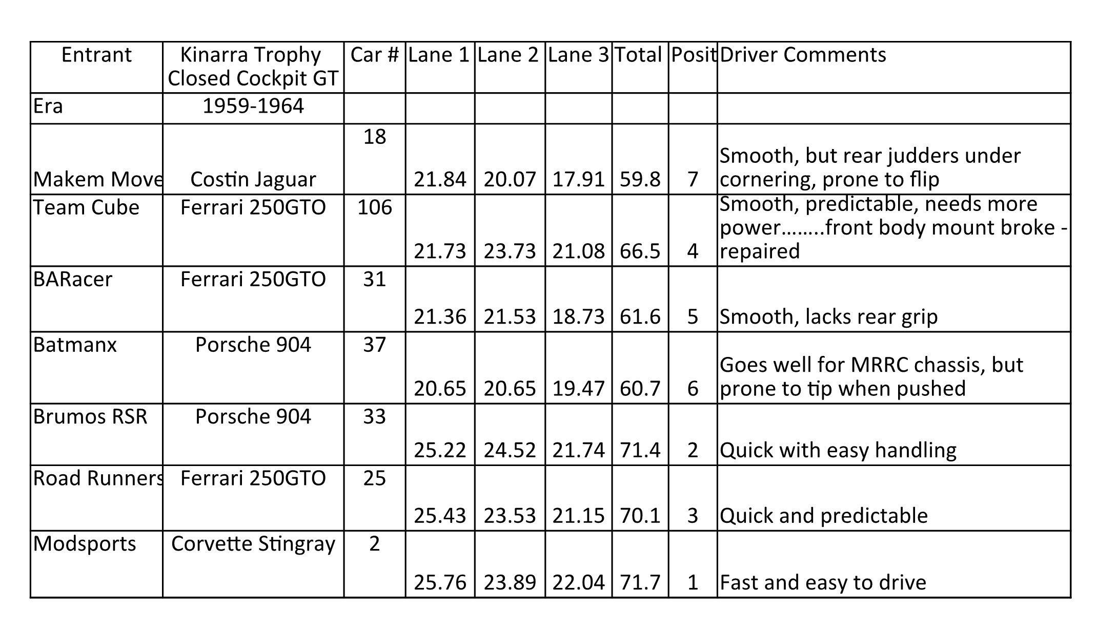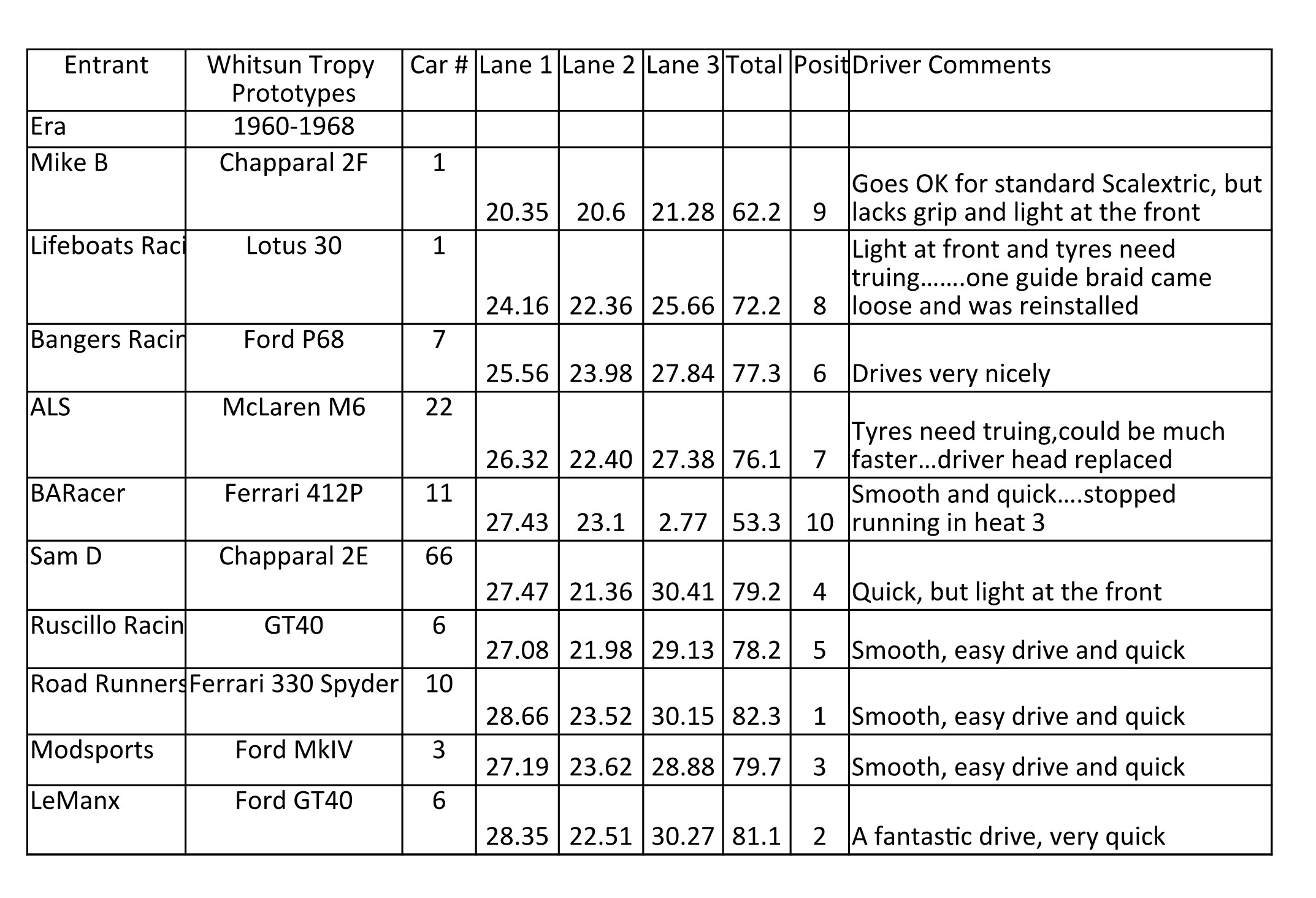 We had a couple of unusual incidents, Makem Dolomite seemed to struggle with some front wheel rubbing on the wheel arches (seemed to be a pick up of rubber accumulating on the body surface. Brumos Camaro pick up guide struggled on one of the lanes due to the thickness of the blade (the other lane was fine). We resolved this by running the car on the same lane twice with different drivers. And finally LeManx Ford GT40 lost its complete front wheels and axle on one of the lane runs. So we decided to repeat this run after we restored the parts back on the car as we were concerned that the car had appeared to run faster without the wheels and axle than with it