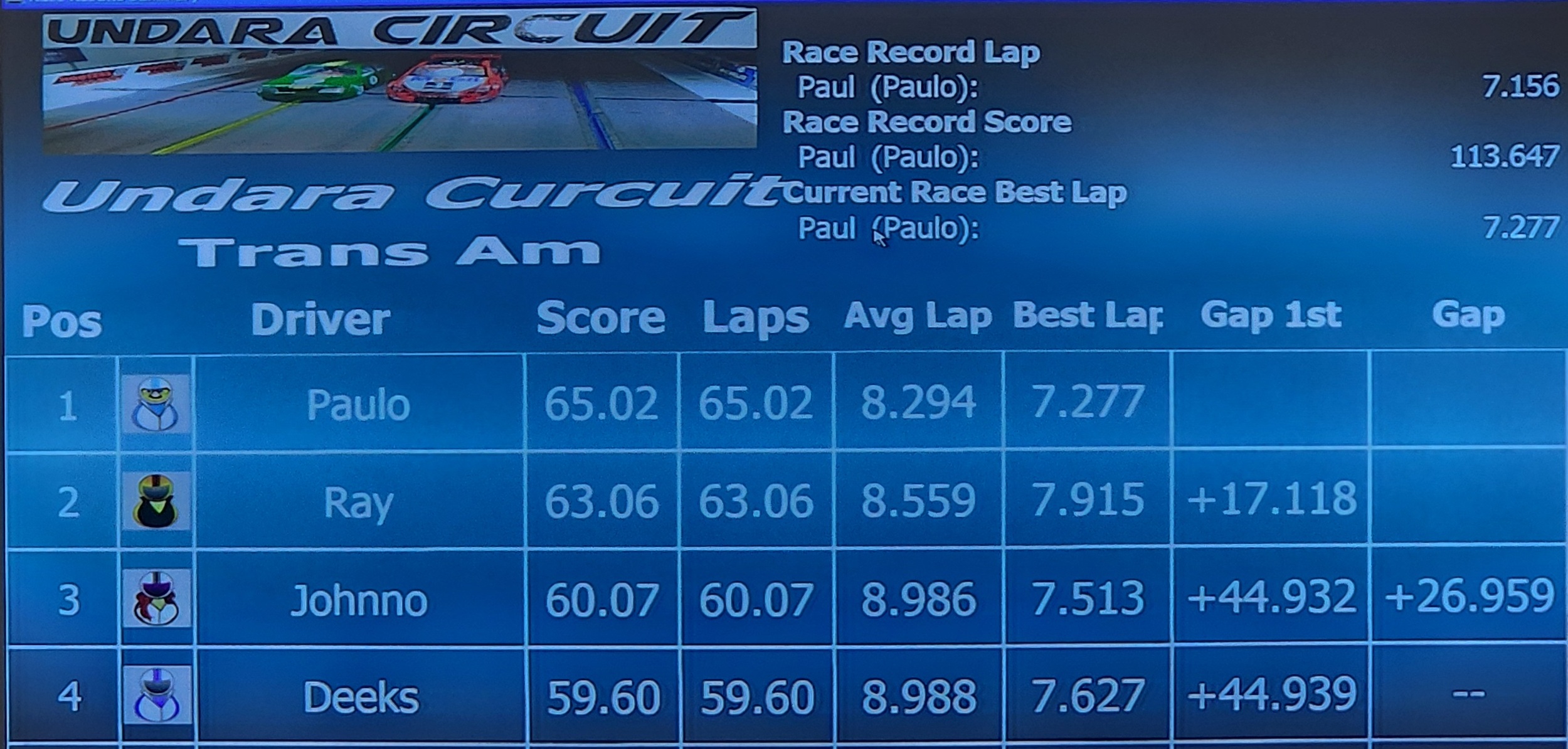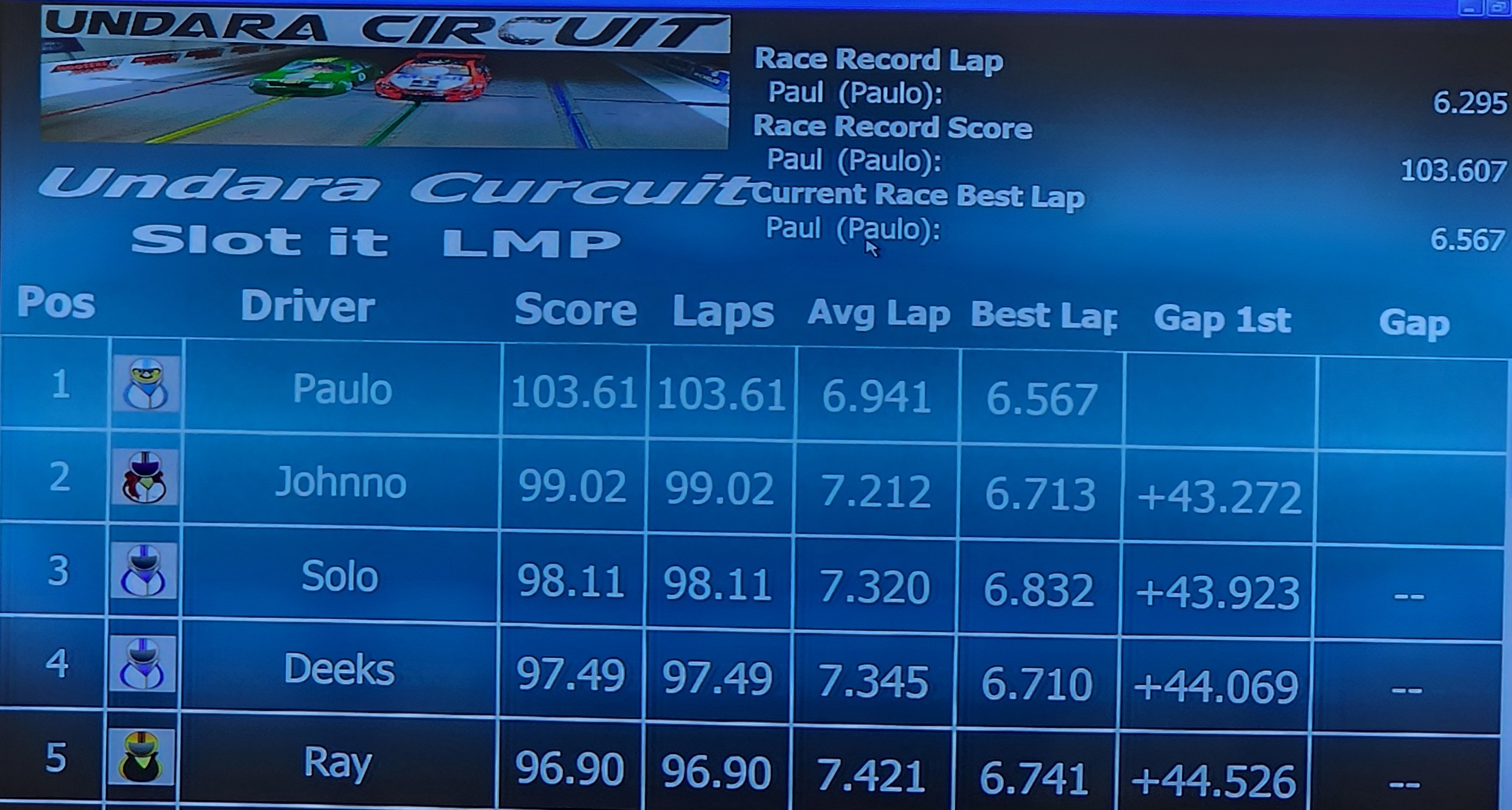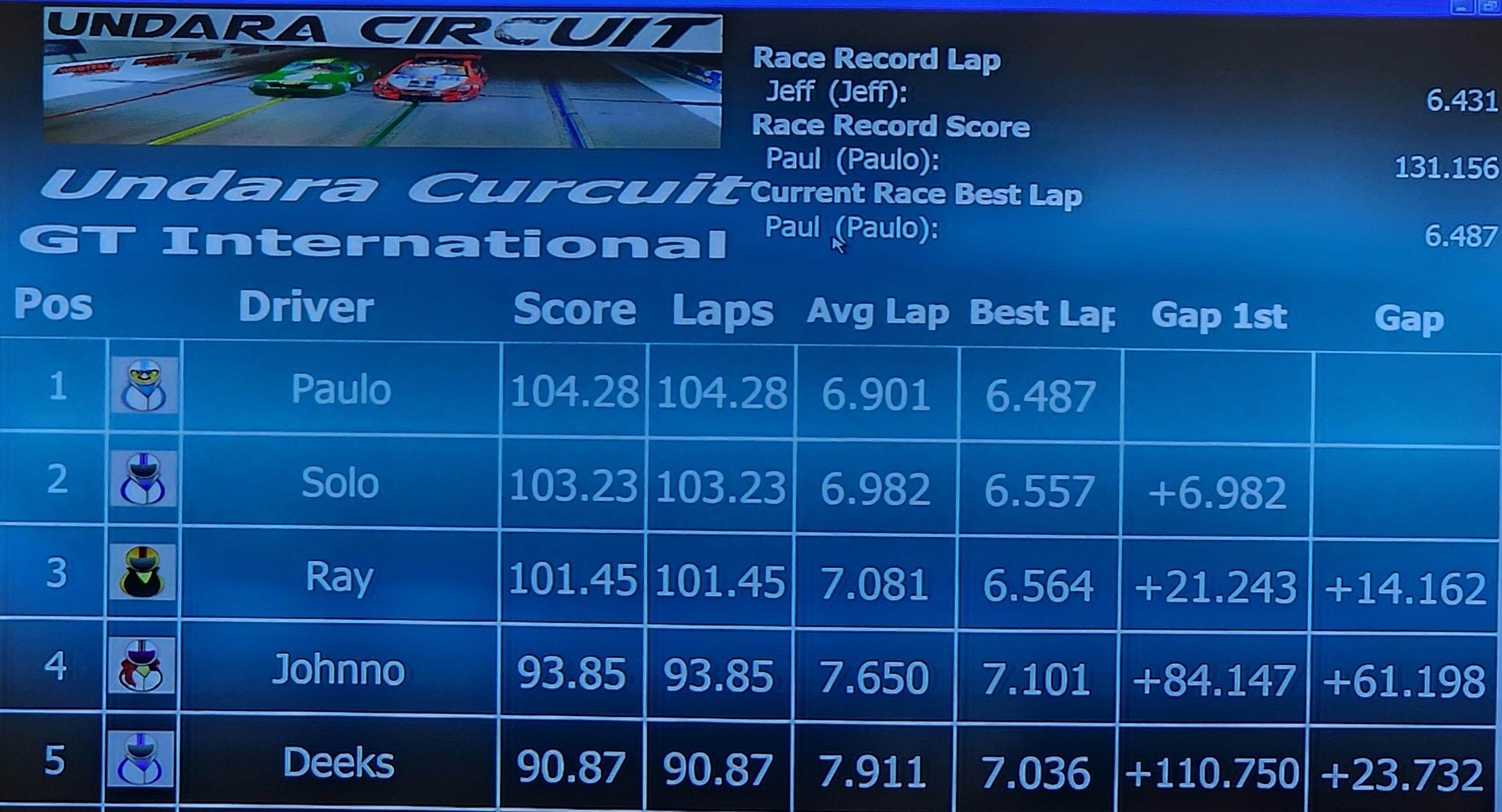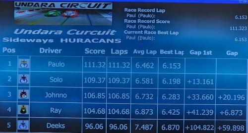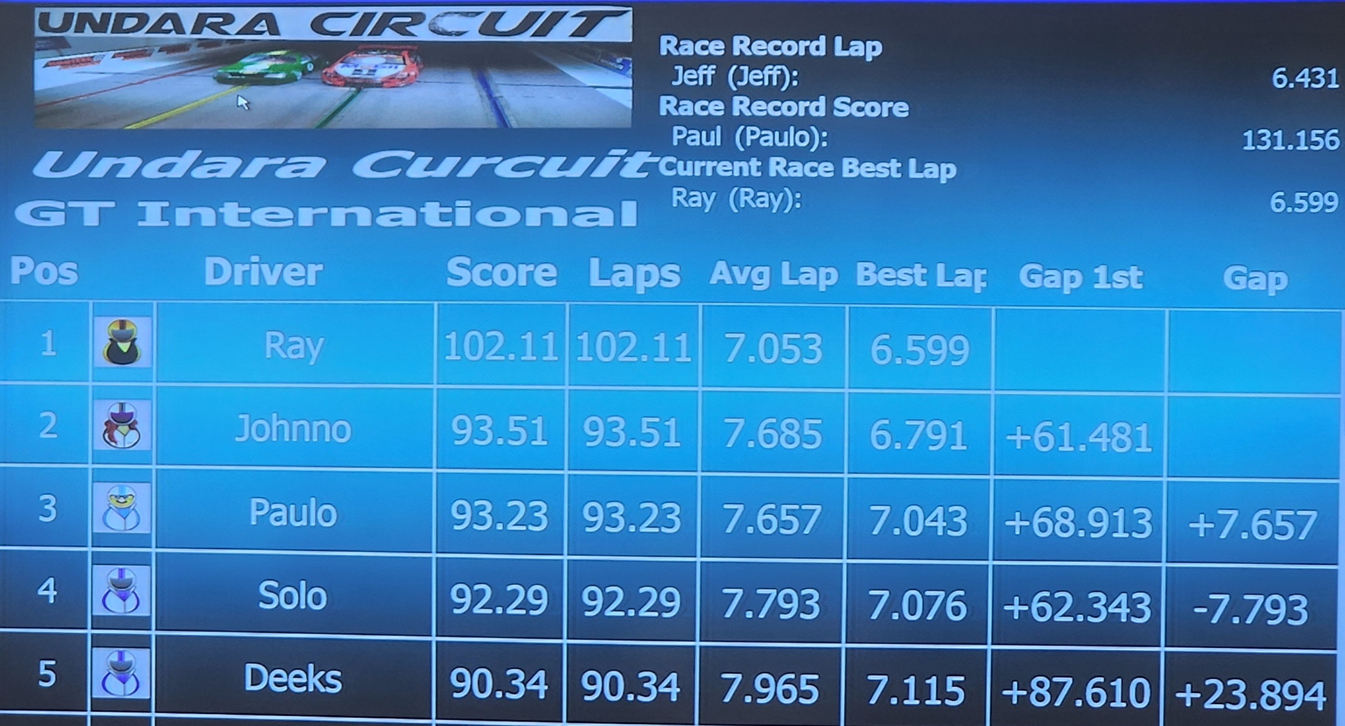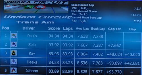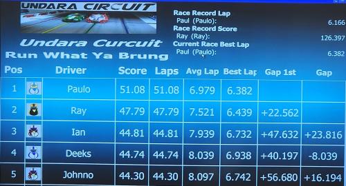 The GT International race saw Paul extend his lead with a score of 95.28. He also reset the current race best lap with an impressive 6.453. Ray finished second again, but the gap widened to over 15 seconds.