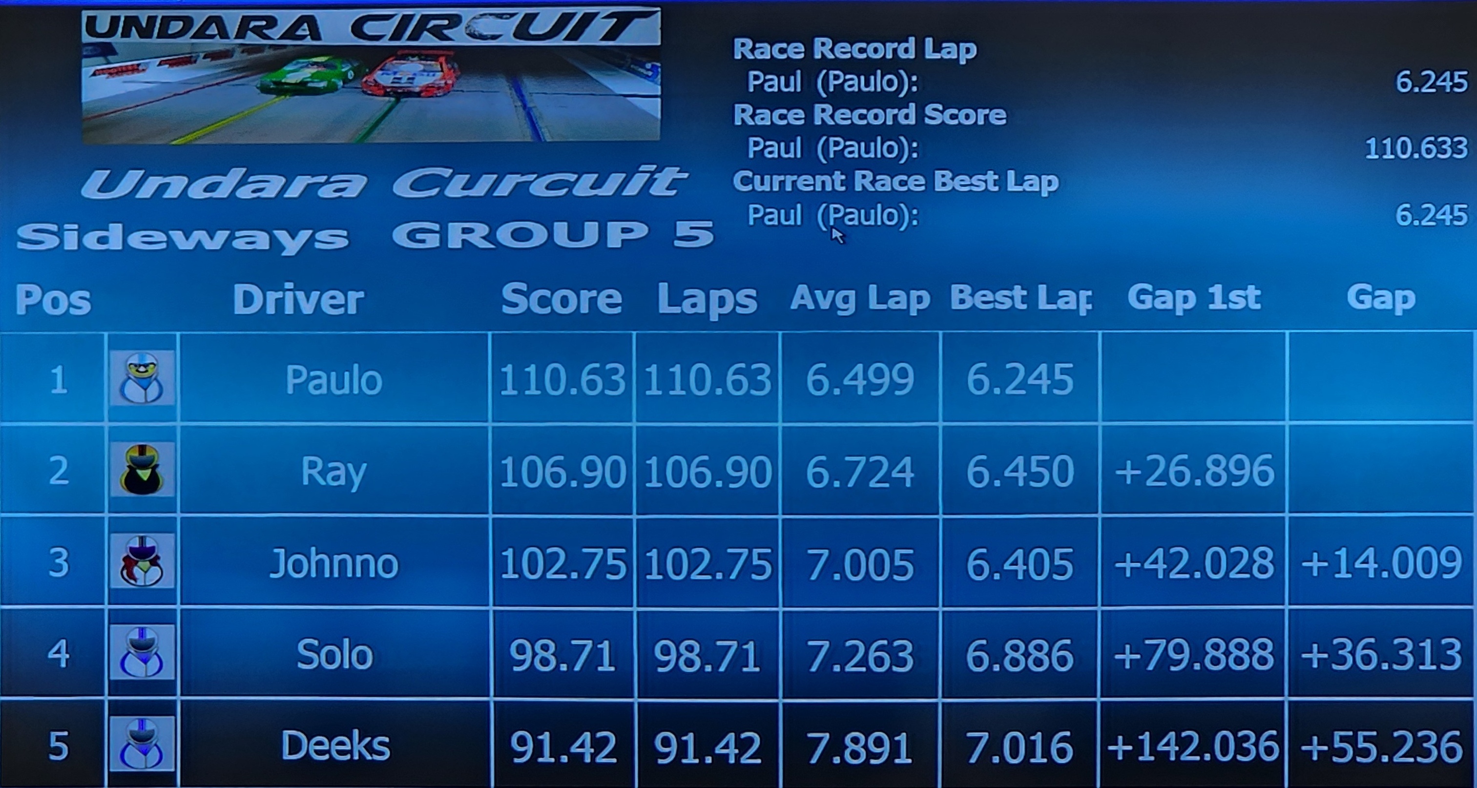 Sideways Group 5 Leaderboard & Race Results