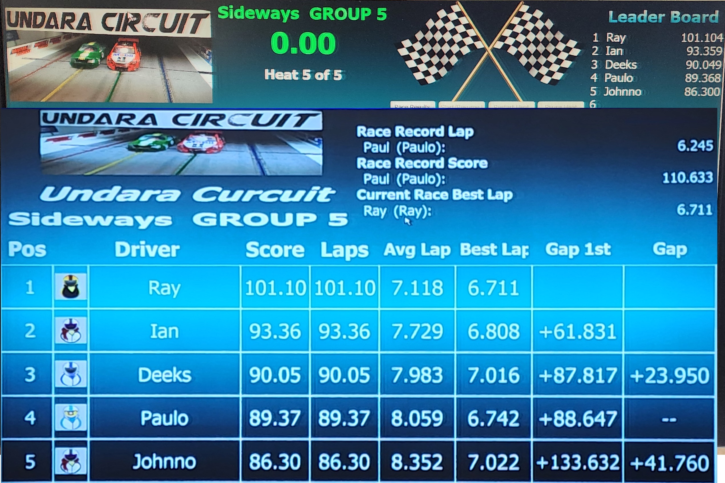 Sideways Group 5 Leaderboard and Heats