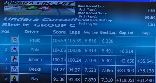 The drama unfolded in the Slot.it Group C race. In a superb drive, Johnno broke Paulo's winning streak, taking the victory with a score of 99.35. Paul finished a close second (98.64), though he did set the current race best lap of 6.506.