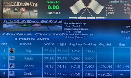 The day kicked off with a close battle in Trans Am, with Paul edging out Ray by just under 2 points, scoring 65.02. Ray, in second with 63.06, was hampered by a best lap time of 7.915, significantly slower than Paul's current race best of7.277.