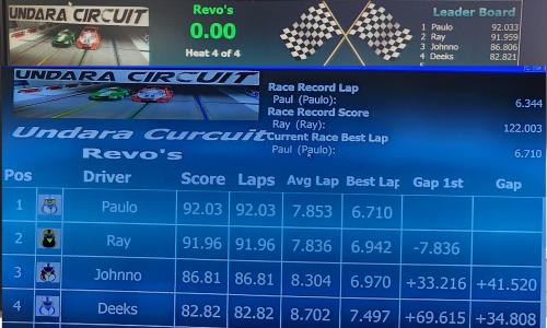 In the Revo's race, Paul took his fourth consecutive win with a score of 91.60. Ray was competitive, finishing second with 89.66 but also recorded the overall fastest lap of the race at 6.598.