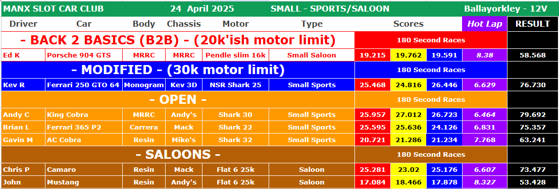 Final results weren’t decided until the last lap of the last heat as Kev raced Brian, Andy leading overall and Mike second as the timer counted down and the laps counted up…Kev just nicked top spot at the checkered flag and Brian was oh so close to Mike for 3rd.