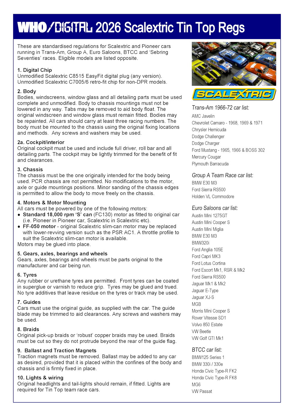 This includes new standardised guidelines for stock Scalextric models across most of the classes we run...