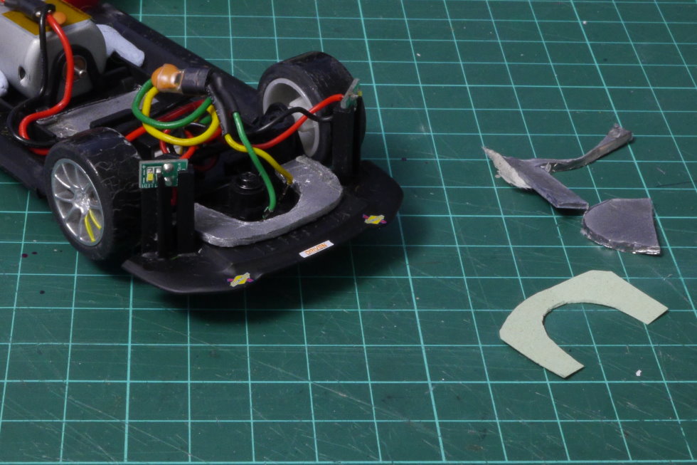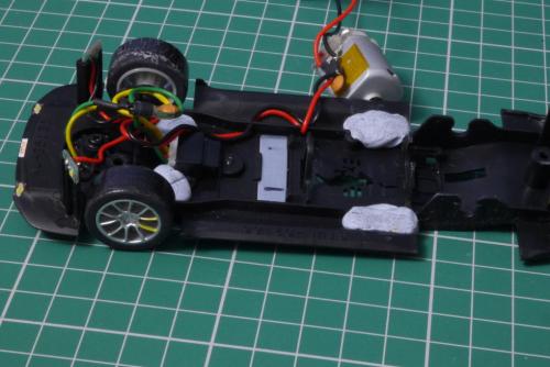 I played with just a little bit of Blu-Tack at the front of the car – as near to the guide as possible. There’s not a lot of space in that part of the car and it’s important not to interfere with the guide or the rotation of the front axle. I squeezed in about 1.5g – 0.75g each side. A more dense material like tungsten putty or lead sheet will be much better for permanent ballast, but Blu-Tack is perfect for experimenting.