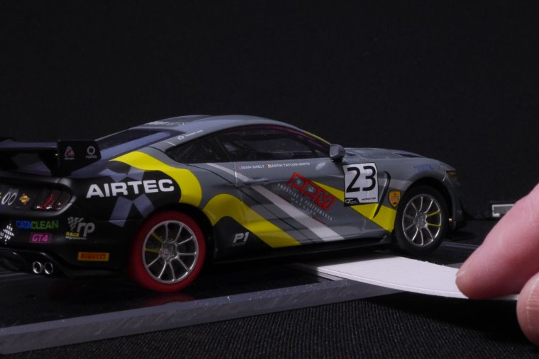 The first thing to do is look at the Mustang on a piece of track or a set-up plate. My set-up plate is a strip of acrylic with a groove cut for the guide – a flat piece of track works just as well. Looking closely at the front wheels – and turning them with my finger – I can see that the tyres are barely touching the plate. This is excellent news (well done Scalextric!) and probably a reason the Mustang doesn’t suffer from understeer. However, I will want to sand the wheels and tyres so they are nice and round and ‘true’.