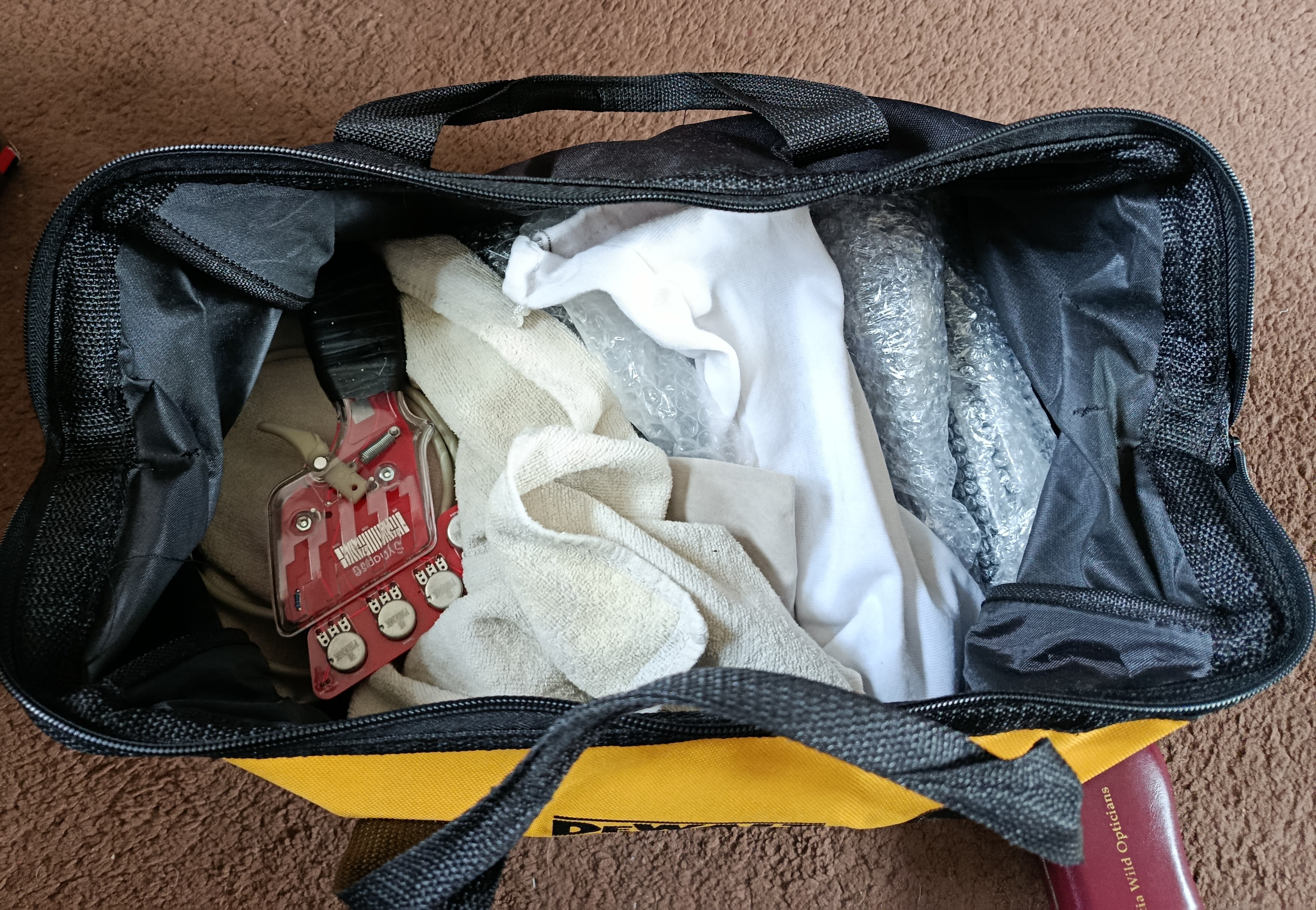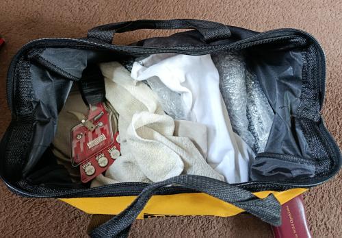 I acquired a Dewalt bag which is used for the three controllers I use (Synapse, Third Eye Gawronski, SlotIt SCP1). There's also a GoPro, charging block and leads and whatever else will fit if needs be for race night.
