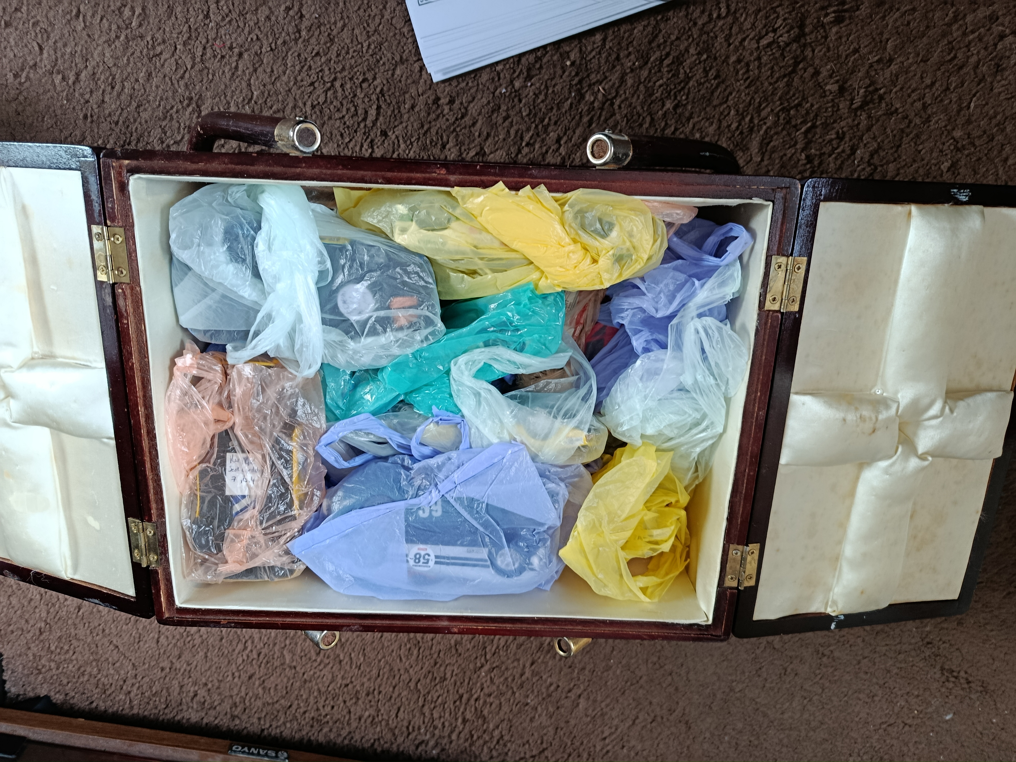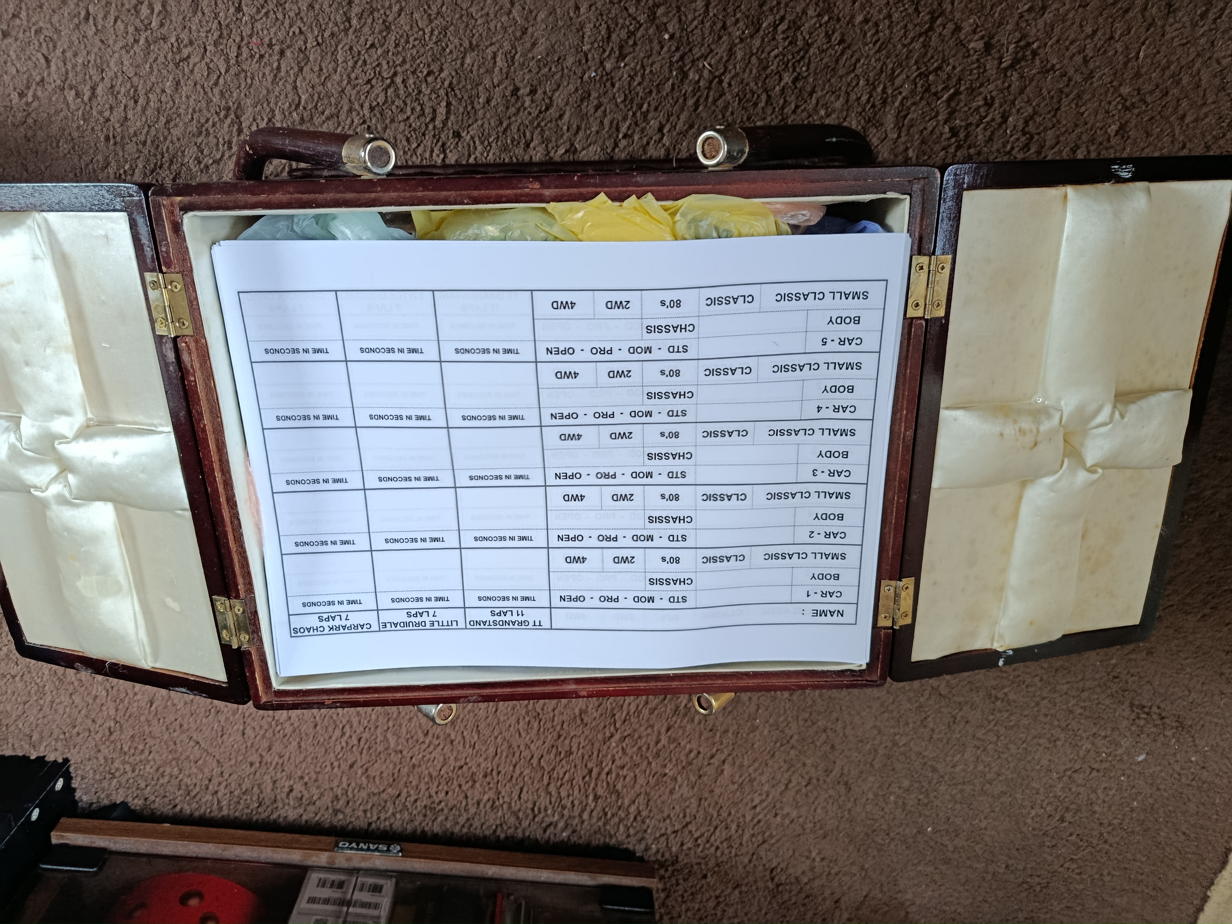 Then there's a box for Slot Rally, an old sewing box the missus was chucking out, now filled with Rally cars (probably 20 or so) all in separate plastic bags. Also room for a handful of timing sheets for club members.