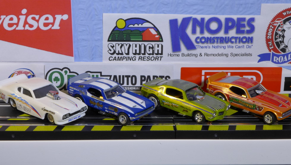 Nostagia Funny Cars - three modern day Auto World ‘Legends of the Quarter Mile’ 4-Gear cars, plus Clive’s wonderful custom Capri on an original Aurora ‘Speciality’ chassis...