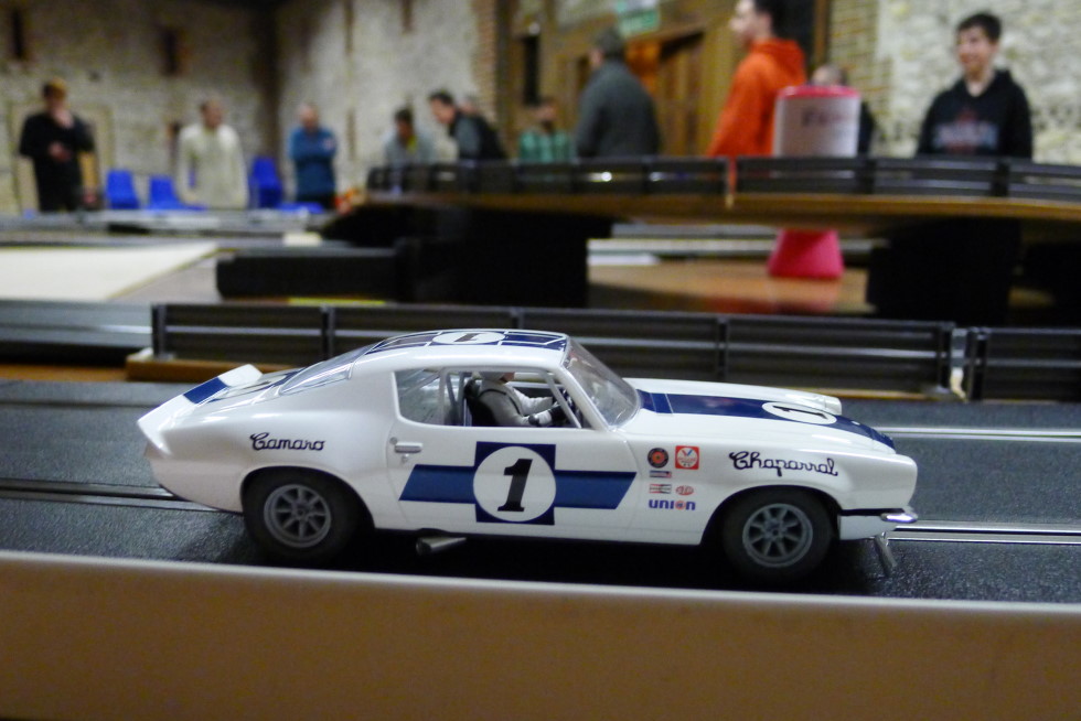 It was a cracking evening of Scalextric digital racing at the Barn last night. With twenty-six on the grid, it wasn't the biggest Digital Wednesday attendance we've seen (two 30s and a 28 eclipse it) - but the Trans-Am pairs race line-up of thirteen cars was a WHO/digital record.