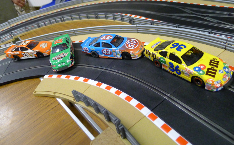 The set-up crew made quick work of Mike’s compact track design, which featured an eye-catching corkscrew section at the kitchen end. The two parallel straights were lengthened by a couple of feet to give a total length of just over 110-feet. Ryan and Andy sorted out the teams using the 2020 WHO/digital driver seedings – and we were ready to race at 7pm with four teams of four and two teams of five. Mike’s grid of five Pontiac Grand Prix and one Ford Taurus looked fabulous – a throwback to the pre-WHO/digital rug racing days.