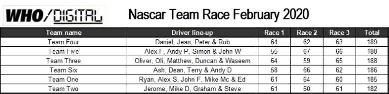 With the three segment totals added up, Daniel, Jean, Peter and Rob were the winners on 189 laps. Oliver and Alex’s teams were level on 188, but Alex, Andy, Simon and John took second thanks to finishing first in the final segment. Not only would overturning those ten feet have given Oliver’s team the segment win, an extra lap would have given them the overall race win… Ten feet was the difference between first and third. Daniel’s team had just done enough with their 63 laps. Ash’s team came in fourth on 62 laps and finished in fourth overall – three laps behind the winners. Jerome’s team were fifth on 61 laps, but that was not enough to beat Ryan’s team to fifth overall.