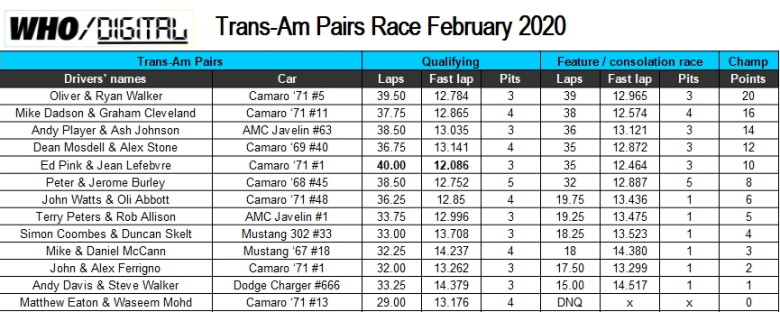 As the clock counted down, Mike had no option to make an ultra-rapid splash & dash and hope Oliver ran out of gas. All of the top four were looking marginal on fuel, but only Alex ran out – on the last lap. He’d crossed the line ahead of Jean, so held on to fourth place. Andy and Ash were delighted with third. However, they were nowhere near as delighted as Ryan and Oliver – scoring their second Trans-Am win in a row. A very impressive achievement.