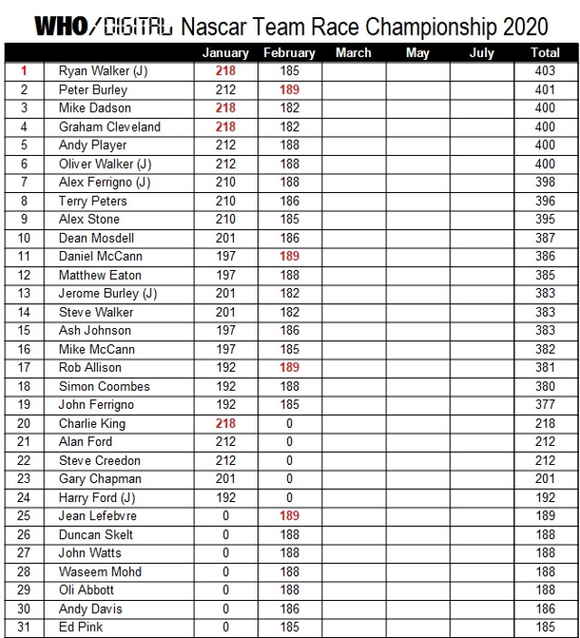 Daniel and Ash worked out a perfect system on Race Control – the bell signalled a driver change for the five-driver teams and the usual flashing light was used for the others. Teams just had to worry about the fuel simulation for the first twenty minutes, to ease everyone into RCS64. Two teams finished on 64 laps – Daniel, Jean, Peter and Rob getting to the line first, ahead of Oliver, Oli, Matthew, Duncan and Waseem. Three laps behind, Jerome, Mike D, Graham and Steve finished in front of Ryan, Alex S, John F, Mike Mc and Ed. So far so good. Ash, Dean, Terry and Andy D were a further three laps back on 58 laps – six behind the leaders. However, back on 55 laps – nine behind the top two teams – were Alex, Andy P, Simon and John W. They’d lost a lot of time, running out of fuel and unable to pit – but digital racing is a learning process, they could only improve.