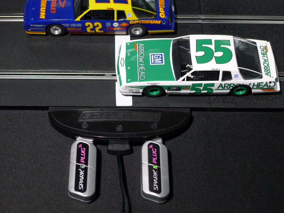 When you plug in a Spark Plug and the power supply, nothing happens until you place a car on the track - the dongle recognises the car (the wheels spin if you hold the rear off the track) and the green LED on the dongle flashes...