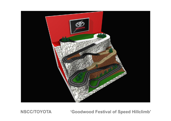 In 2006 the NSCC was asked to provide a slot car exhibit for the Toyota stand at that year's Goodwood Festival of Speed. Over a period of four weekends a team of NSCC members led by Gareth Jex built what must surely be one of the largest slot hillclimbs ever constructed.
