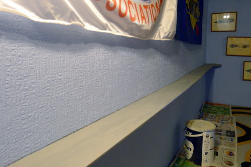 I considered cutting out the curve from the mdf, but soon realised this wasn't going to work - they'd be no room for the track. Instead, I cut the mdf into three pieces and did a little trimming so it skirted around the bulge and allowed the drag strip to stay fairly straight. Batons and a couple of braces were fixed to the wall, mdf fixed to them - and I had a shelf. The mdf was sealed with grey primer and the bottom of the shelf, batons and braces painted blue to blend into the wallpaper...