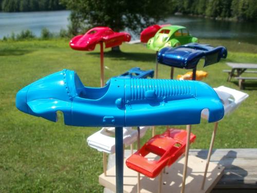 I own the blue Porsche 550 Spyder at the far end, and the green Rover BRM at the near end. The rest of the cars are owned by other club members. It was a fun evening. The Rover came in 1st in "slow-sports car". Everyone else is running brass/wire chassis.