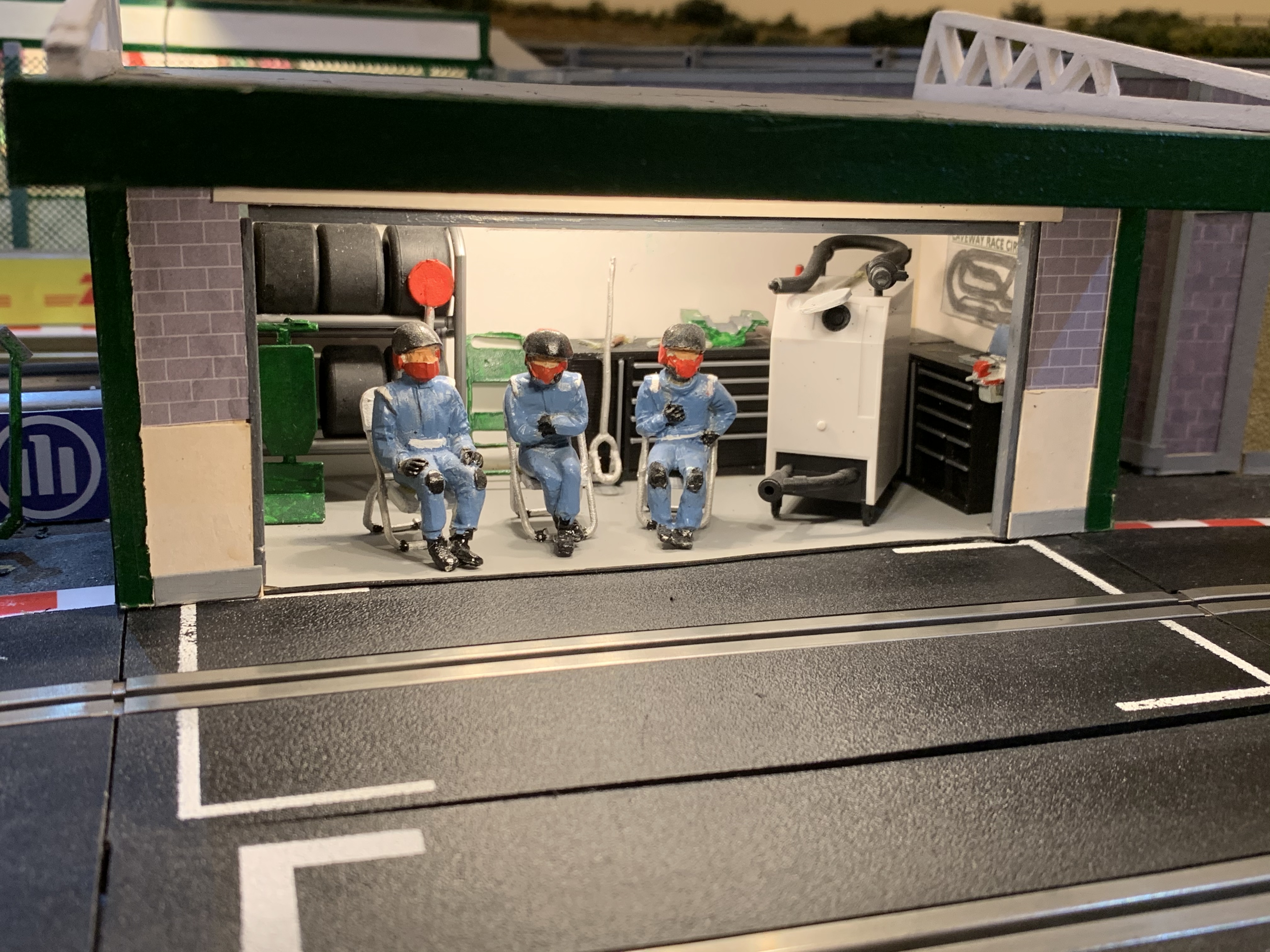 All the track is standard SSD parts with SSD borders and barriers, which were painted cut and generally modified where necessary. In order to ensue reliable running, particularly given the permanent nature of the layout, all the track parts have individual feeds soldered both across lanes and from piece to piece. All four sections of track feed into a central plug in board (under the grandstand). This belt and braces approach has avoided any voltage drops/issues. The albeit tiny pit lane has the pit lane challenge game track, with for the purposes of realism has the associated tower wired to a remote location on the side of the board.