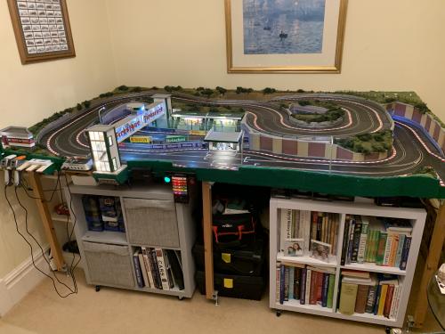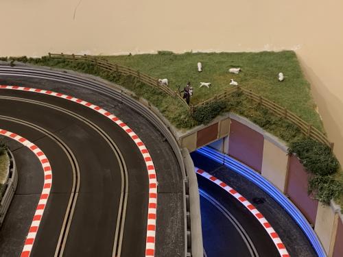 The whole premise behind the layout, obviously aside from racing, mostly with pace cars (so no curves less than second radius), was to apply a level of ‘model railway’ level of scenary. Of course, and particularly given the relatively large size of 1/32 scale, the very limited space available is going to lead to inevitable compromises in the overall levels of realism, but hopefully I have captured the ‘flavour’ of a real race track, and perhaps shows how something completely self contained can be built in a small space.