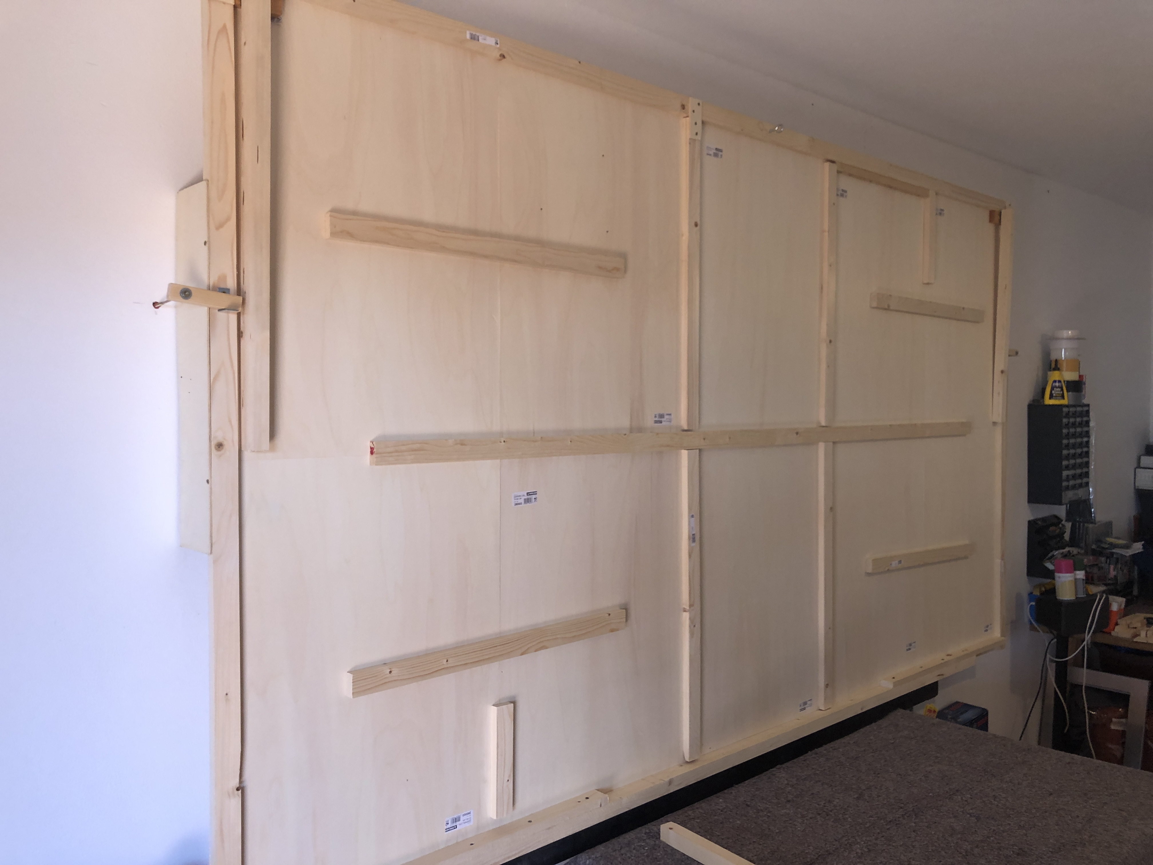 The base plate is made of 5mm thin wood and hinges on the wall. It measures 300cm x 166cm. The construction is reinforced by 4 cm thick square timbers.
