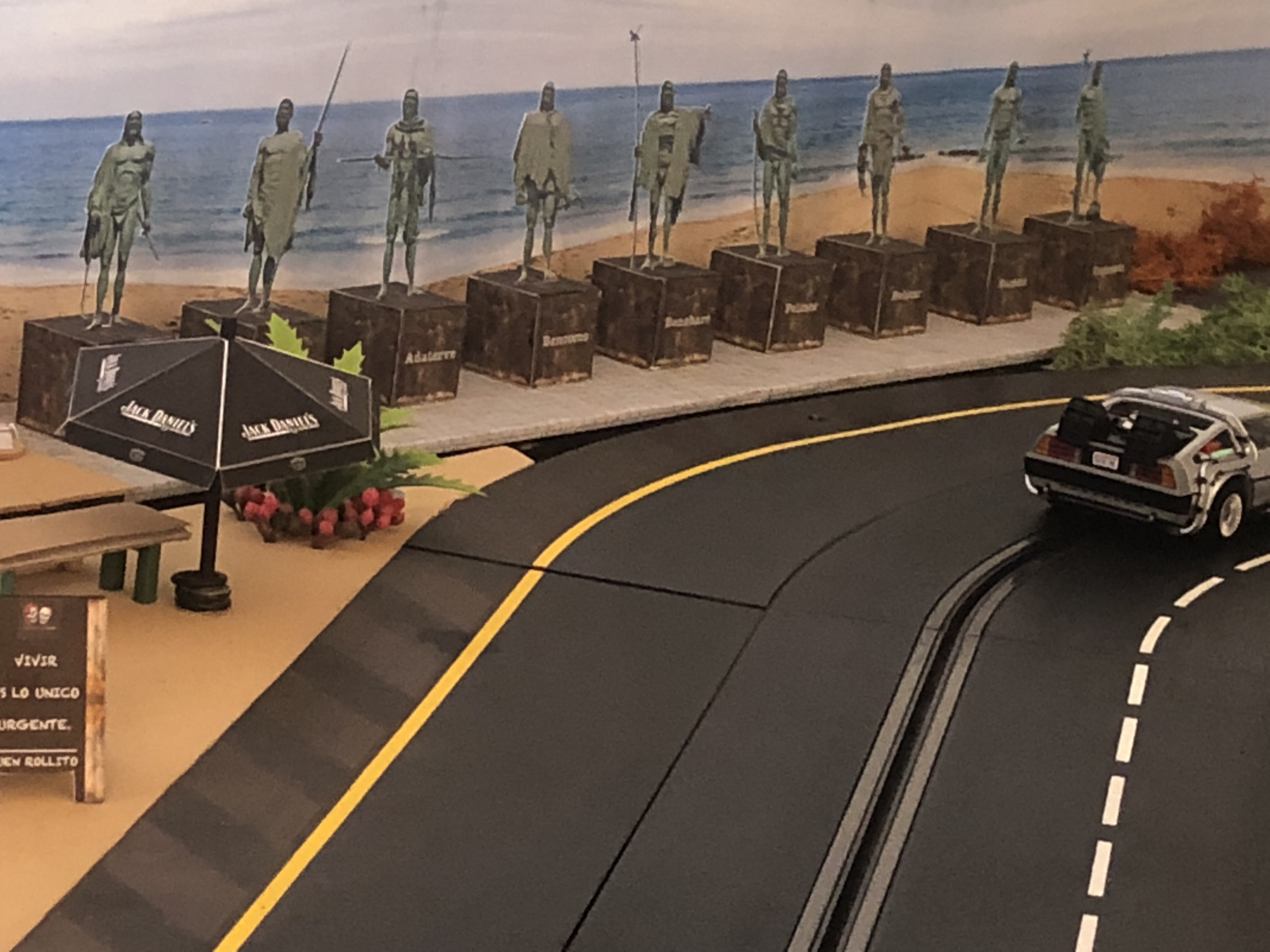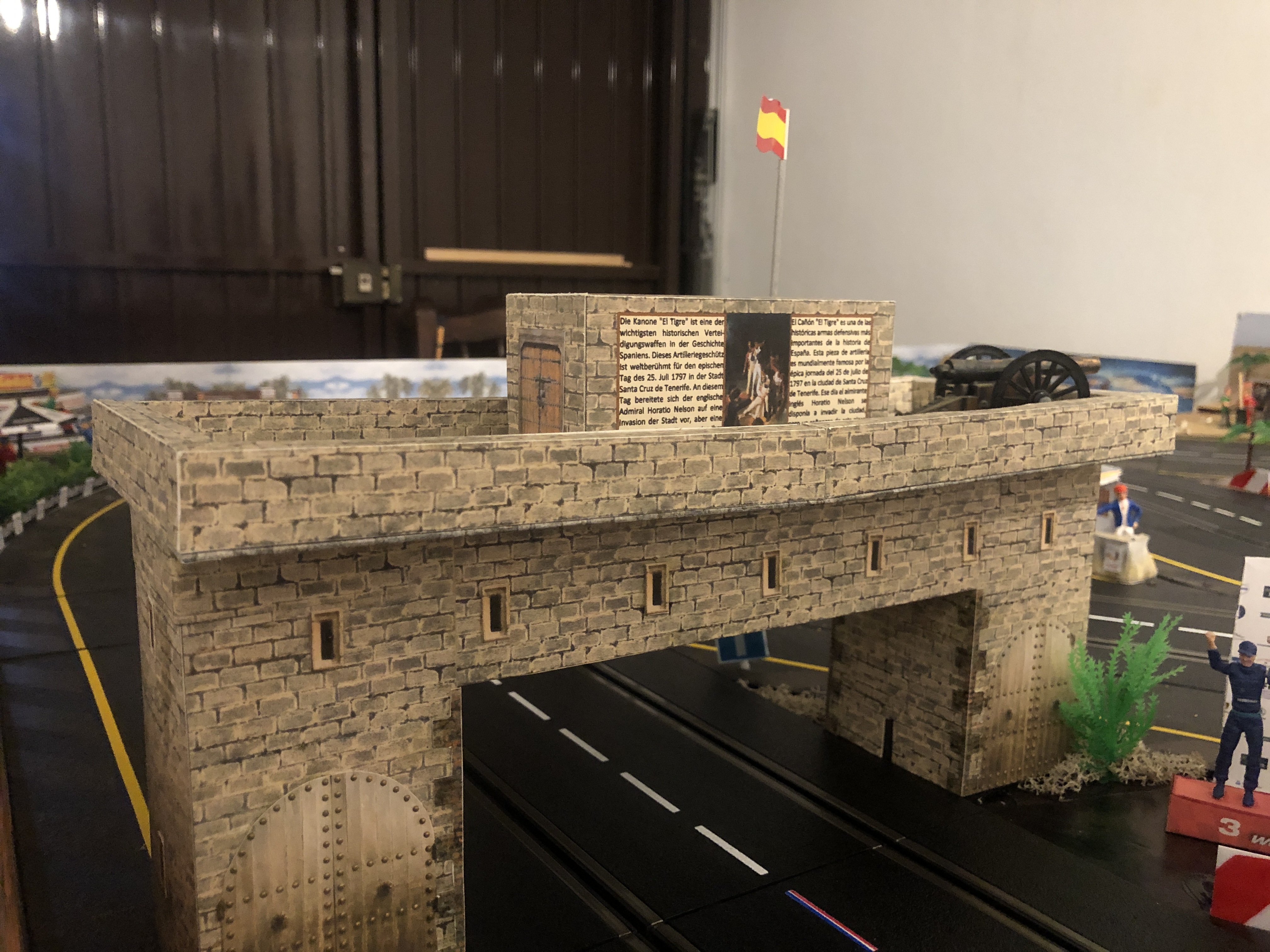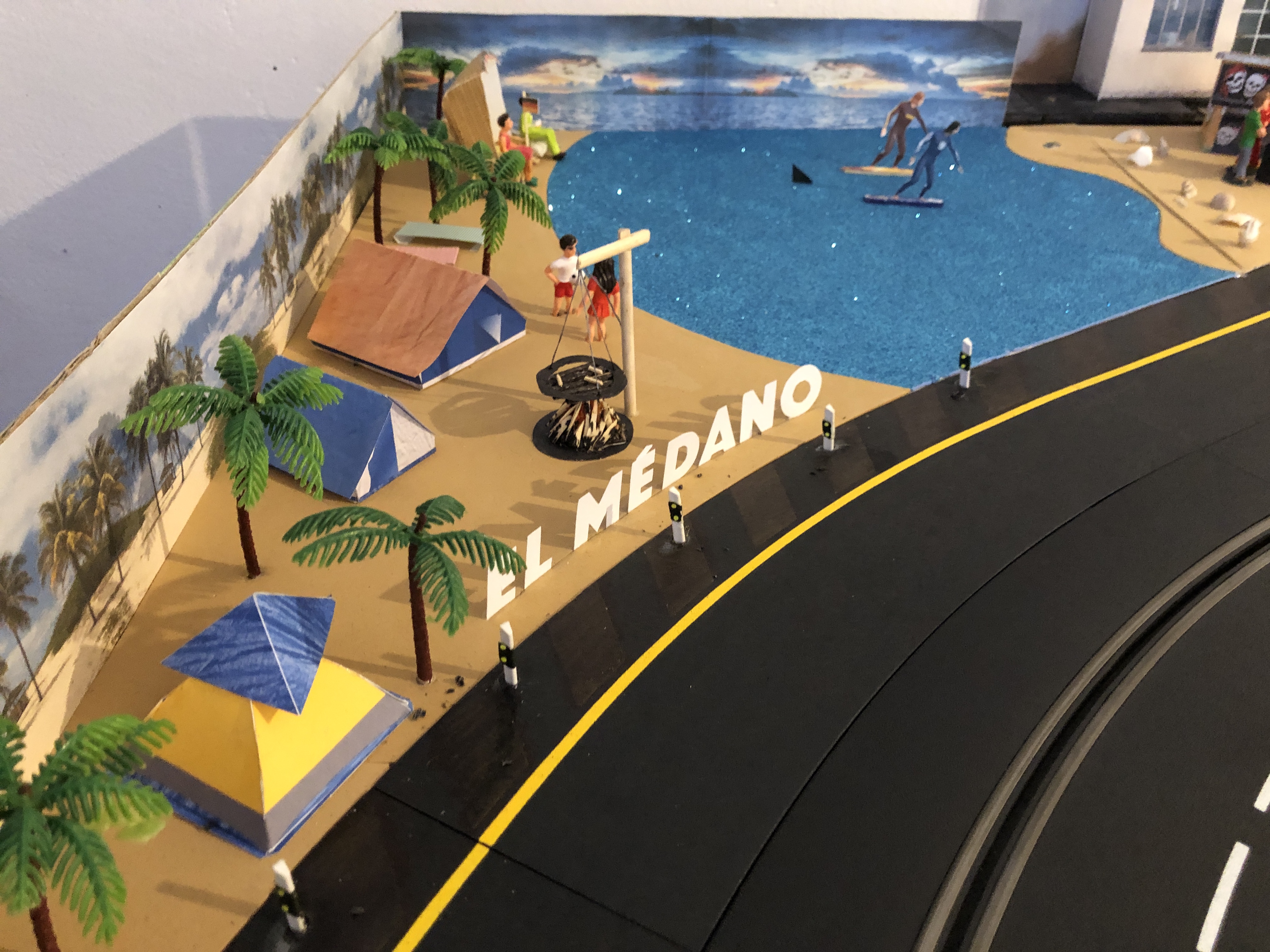 The original idea was to thematically design a track with the framework of the racetracks of the 1960s, mainly following the example of the Nürburgring. After some construction, however, it quickly became clear that the landscaping should also include elements from our new home. Tenerife certainly offers more than enough sights and motifs. The difficulty is to represent a motif on the available space in such a way that it fits in and yet looks somewhat realistic. On the whole, this worked out quite well, if several attempts were necessary with various elements. But, from experience you become wise and learn from each model.
