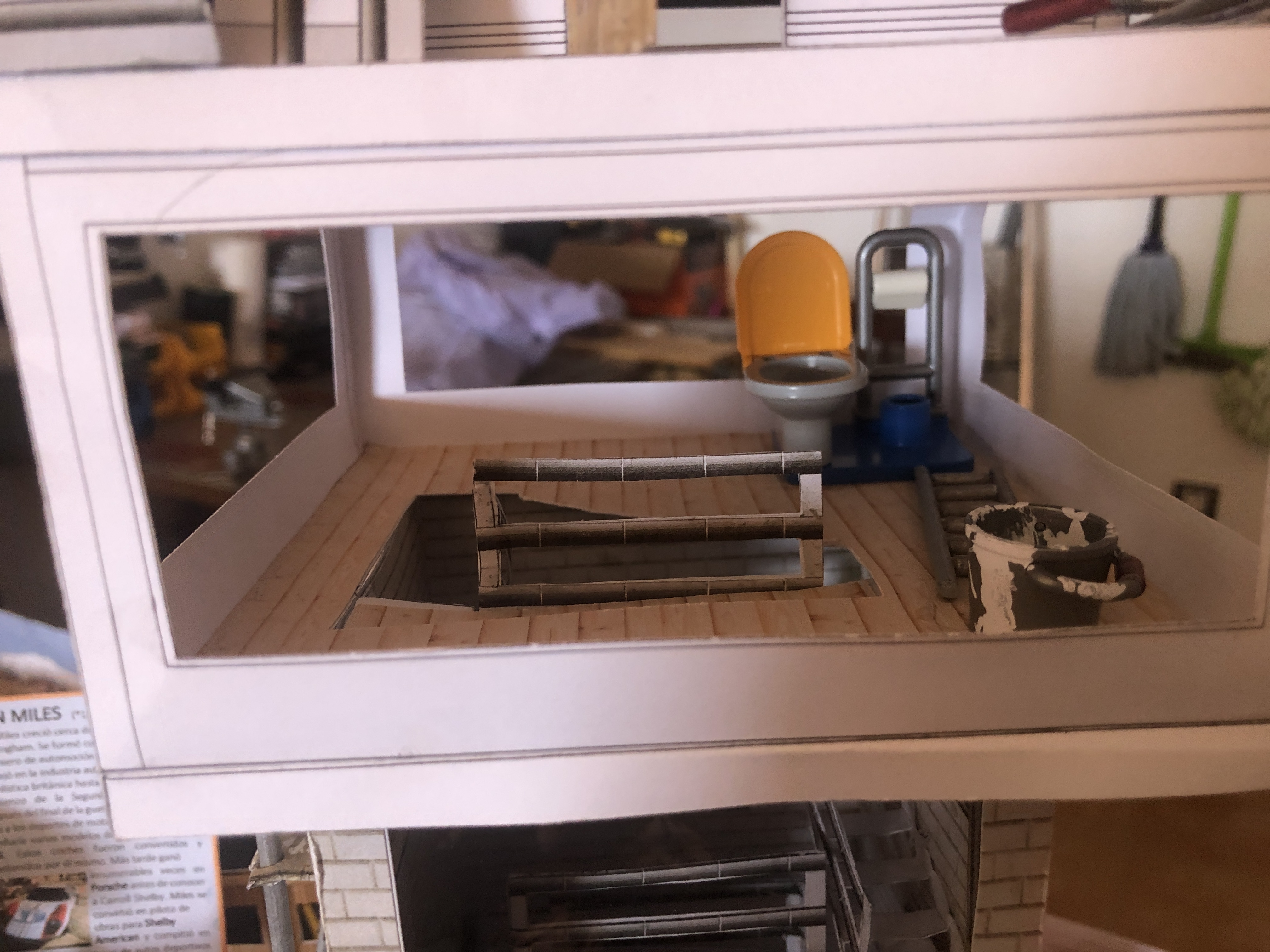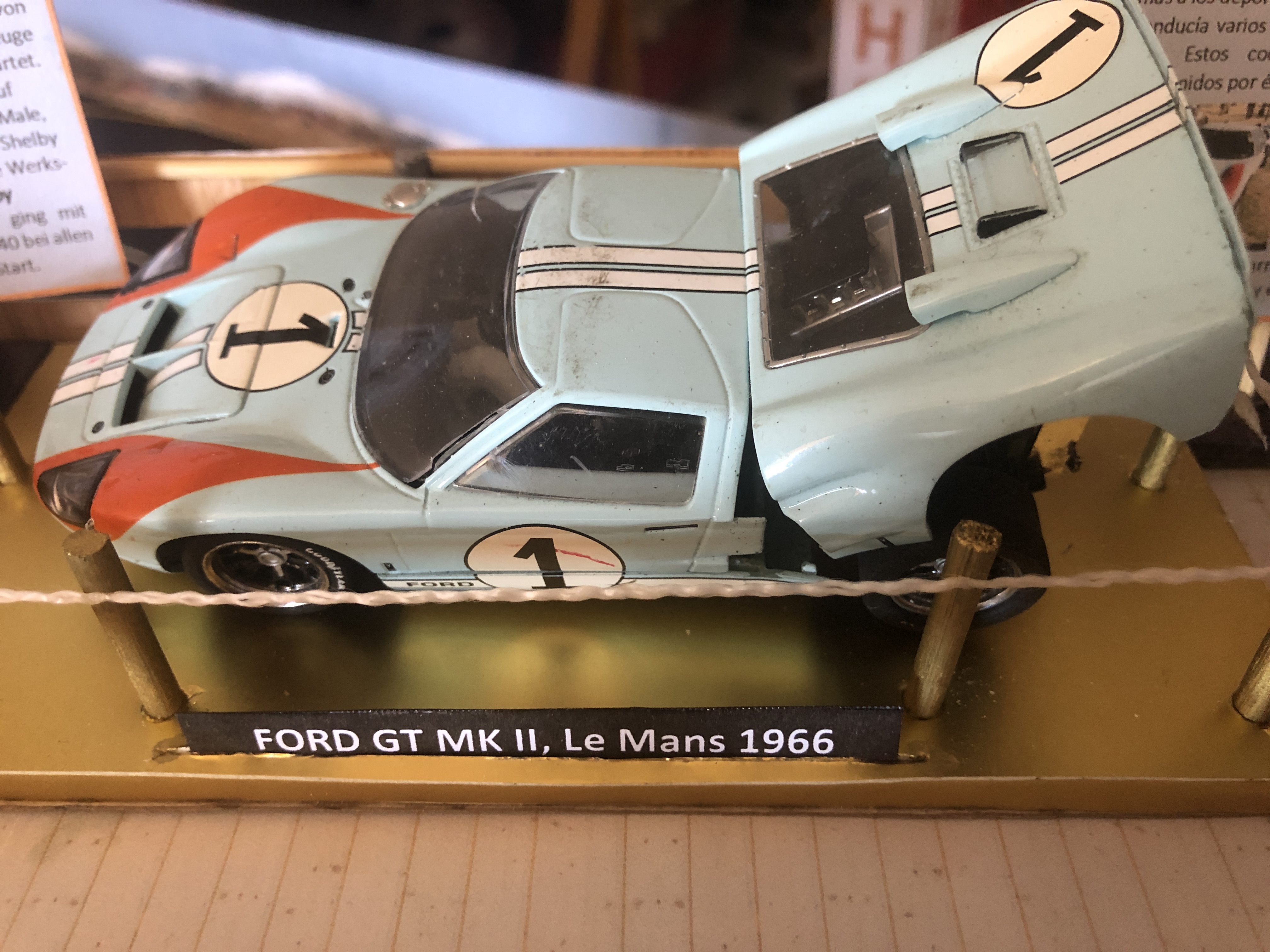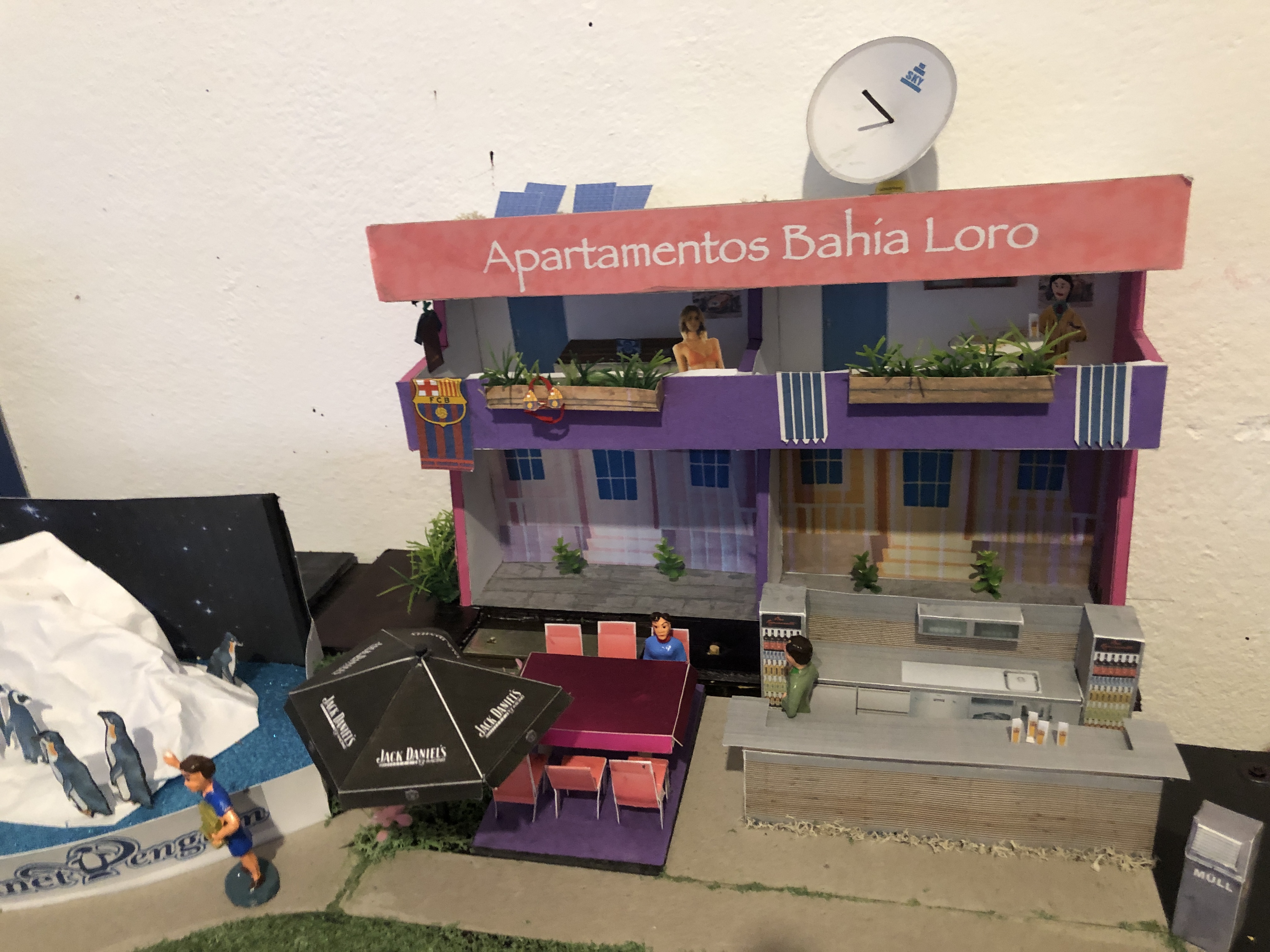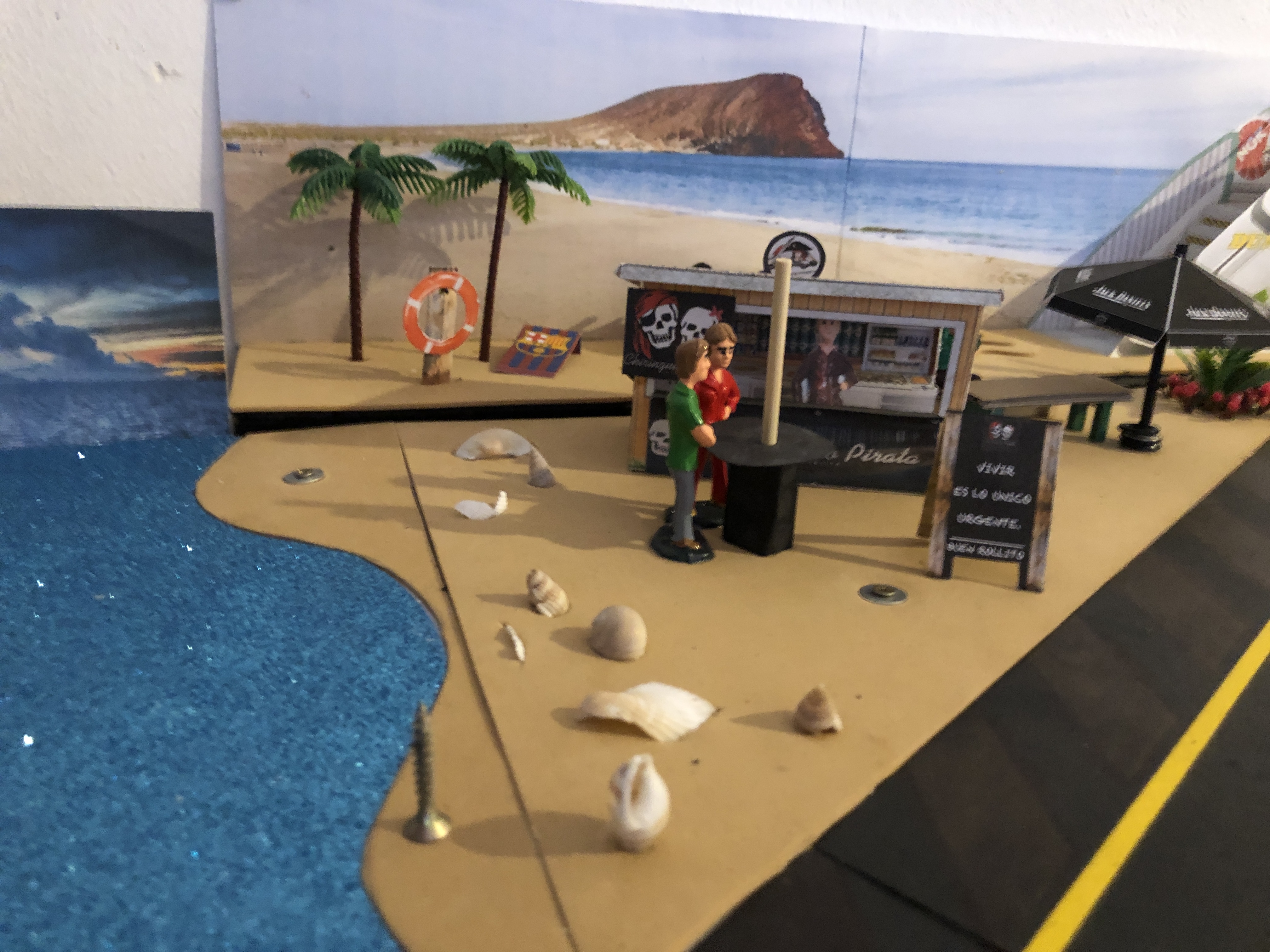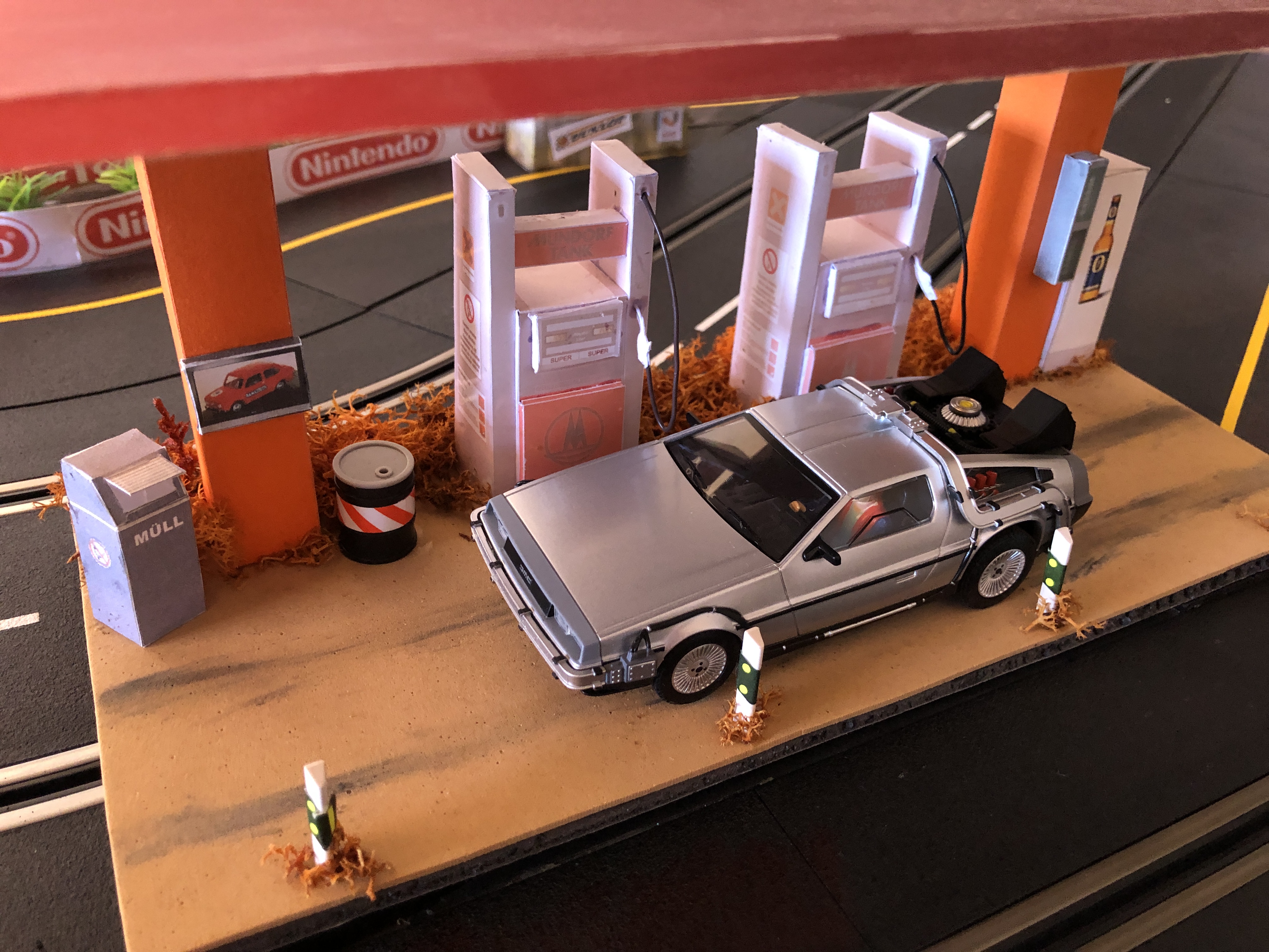 All components (except the rail material, some figures, the palm trees and the bushes) are made of paper (80gr / m2), cardboard (180gr./m2) or 5mm foam sheets. For some elements, toothpicks and thin wooden sticks from the craft supplies are also used. Lightweight construction is the central requirement so that the weight can be borne by the thin wood and it does not break. The car models Ford Mustang, Mercedes 190 SL, BMW 2002, Porsche Carrera and the Toyota Hilux are also cardboard models, as are the airship, the helicopter, the orca and the dolphin in the park. Many elements are in-house designs, but a big thank you goes to carrera4fun (the greatest site ever in this area), slot-hobby, pedemann-online, Canon and Epson for the many, many templates and ideas.
