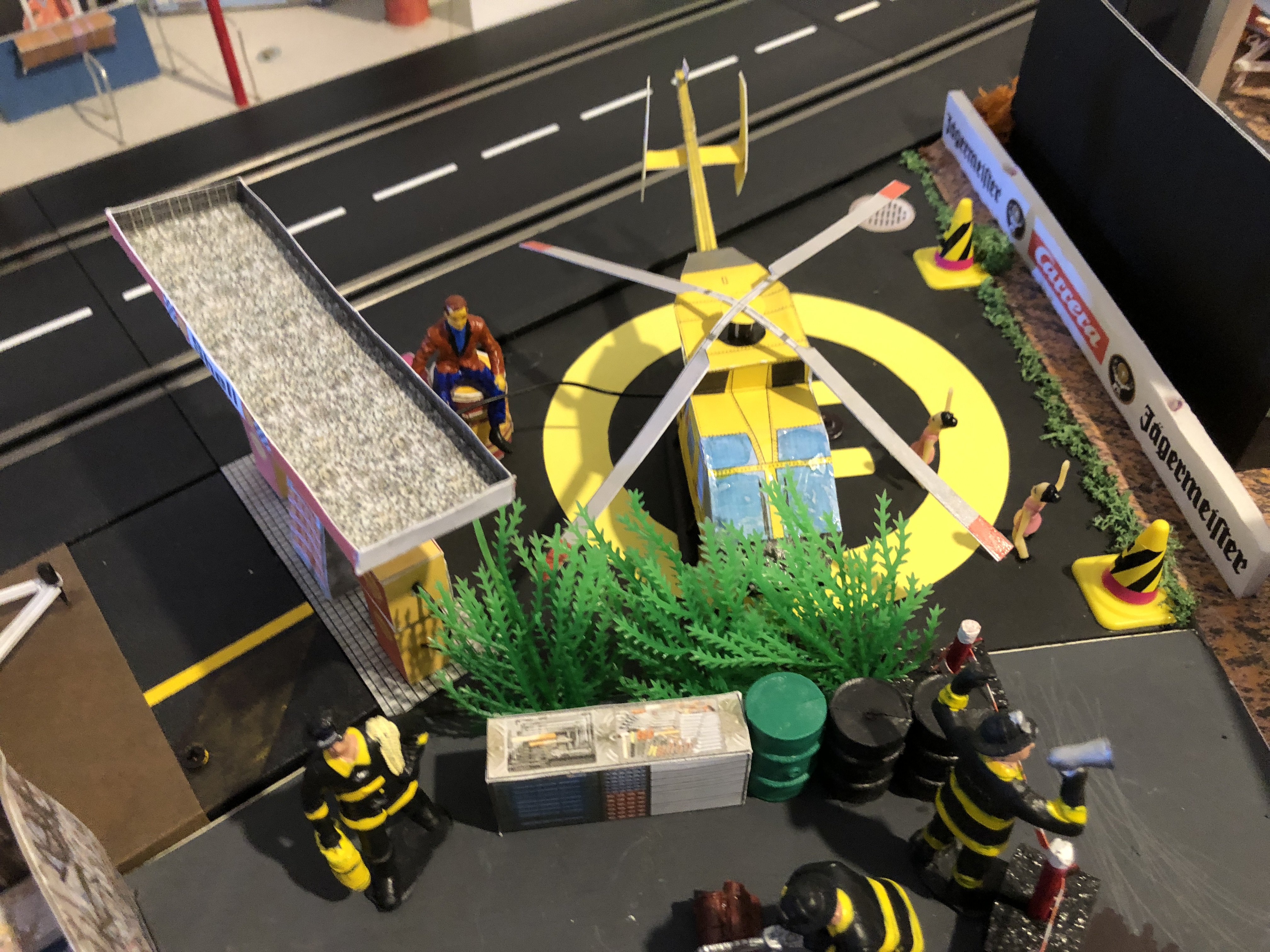 When folded, the track has a distance of 9 cm to the wall. The buildings are therefore a maximum of 8.5 to 9 cm high. Higher elements are provided with "paper hinges" so that they automatically fall over when the track is closed and straighten up again when opened. These include, for example, the Orca in Loro-Parque and one or the other tower on the site. The only exceptions are the lap counter and the press tower, which have to be removed manually before closing.
