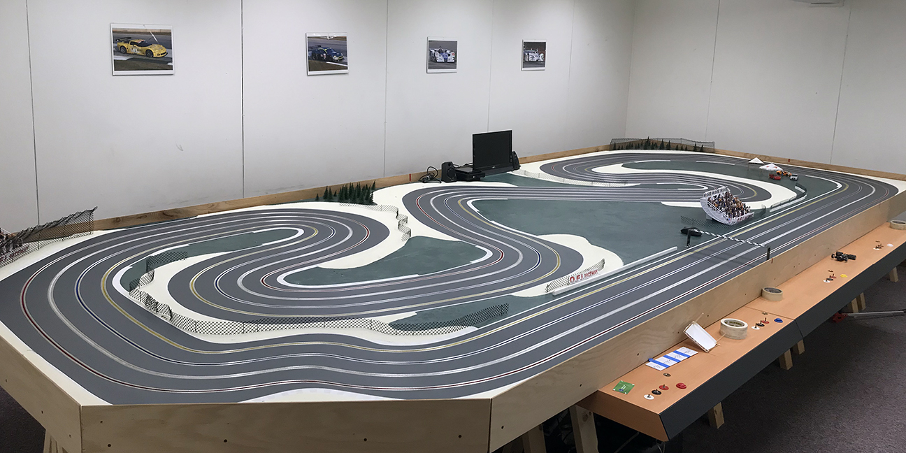 2) WOODLAND TRACE RACEWAY (aka Laguna Trace) ~ Steve Acesta's 80' four-lane routed mdf with 3.5" lane spacing, Winston-Salem, NC