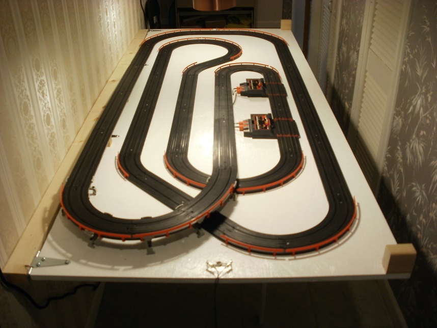 A 2x4 was securely attached to the wall. Then 4-hinges were added to a 3-foot by 7-foot plywood board. The track is screwed down to the plywood. Two hinged supports fold down by gravity. The wiring runs under the track to each end. With children of any age, cars are likely to fly off the track. The design of the track is somewhat self marshalling by each racer.