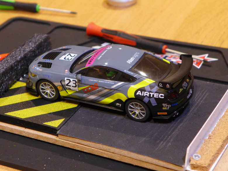 The tyre truing process took me just over ten minutes for the Mustang shown here. Tyre residue did build up on the sandpaper and I brushed it away from time to time with a soft brush from my tool kit. And there was plenty of muck that came off the tyres when I cleaned them on masking tape. There'll also be tyre dust in the back half of the chassis and - if you do it with the body on - there'll be the underside of the body to clean out too...