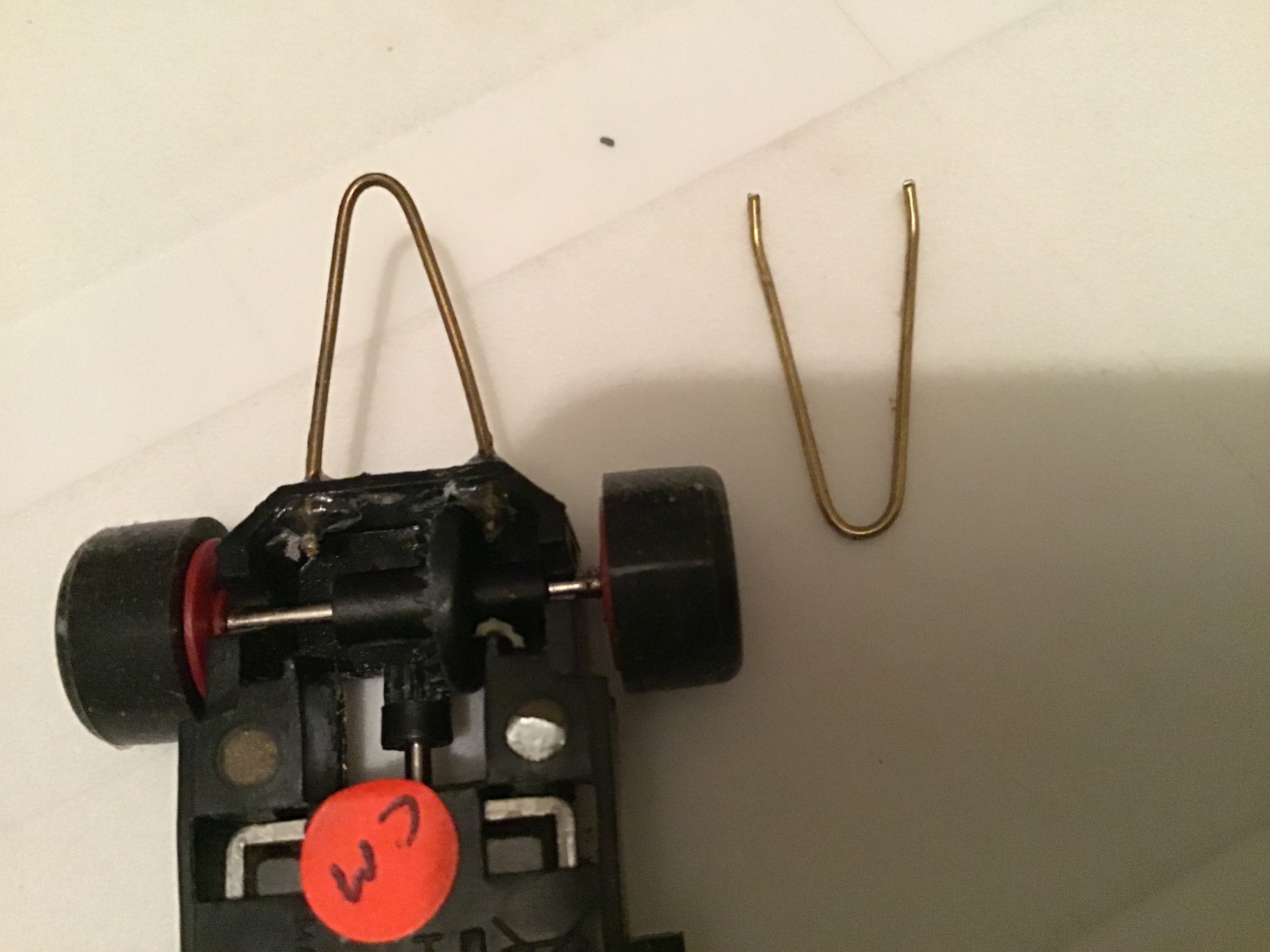 When the glue is completely dry sit the car on the track and carefully bend the bar down until it is close to the track but not actually touching it. I hope this helps.
