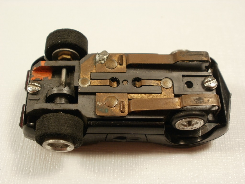 The dragsters featured a 5 ohm blue/gold armature. Although coveted at the time, many have poorly centered comm plates, making them little more than a novelty hand buzzer. Also notorious for slinging their winds, a light brushing of thin epoxy, will keep them from suiciding. Many have been pilfered from the original dragsters. Still and all, a good blue drag arm is great drop in fun. The Specialty chassis also used a 12 tooth pinion, rather than the standard 14 for AFX. Keep in mind that because of the added gear, the magnet positions are reverse polarity from the 3 gear chassis. The rear axle is unique due to the tubbing of rear chassis.