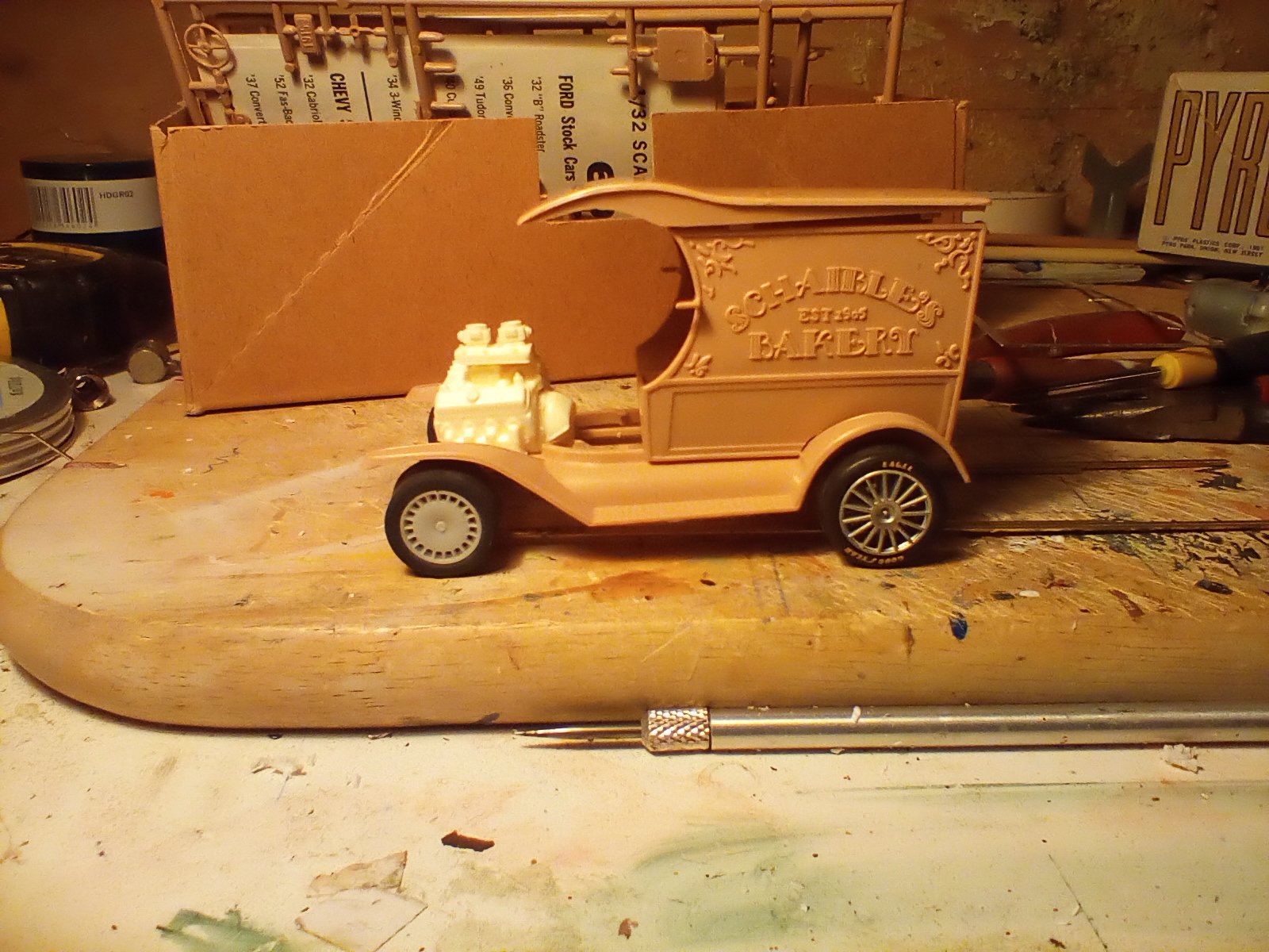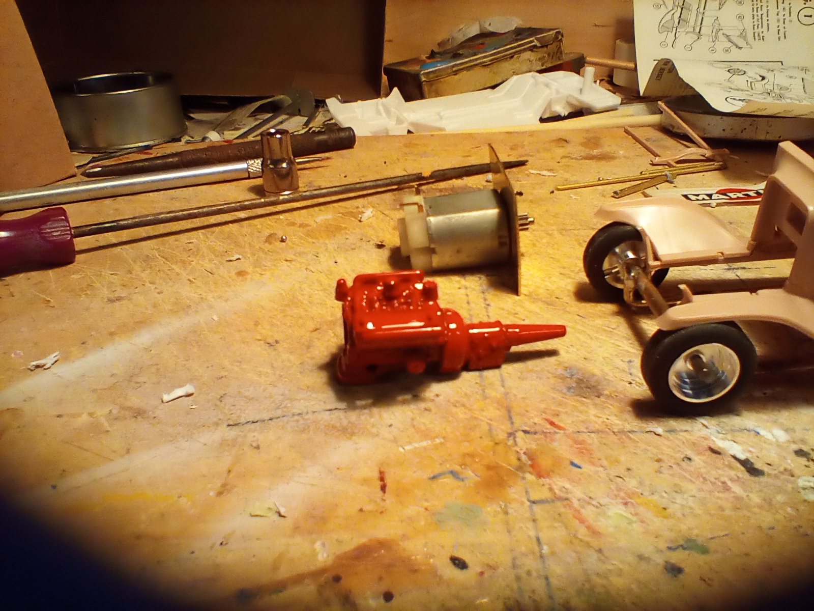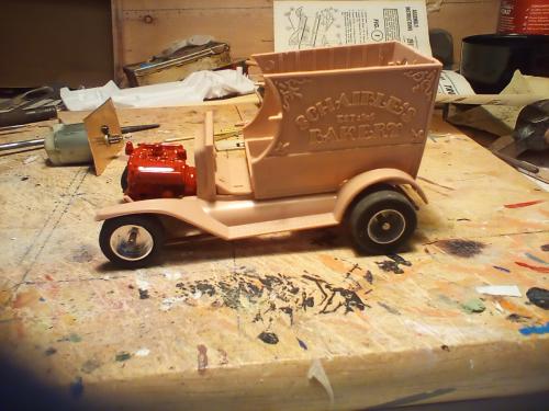 Did a little more to the Pie Wagon, made a simple chassis and hopefully the motor I have is not very powerful .TheV8 came from a Revel kit with more chrome parts to add .