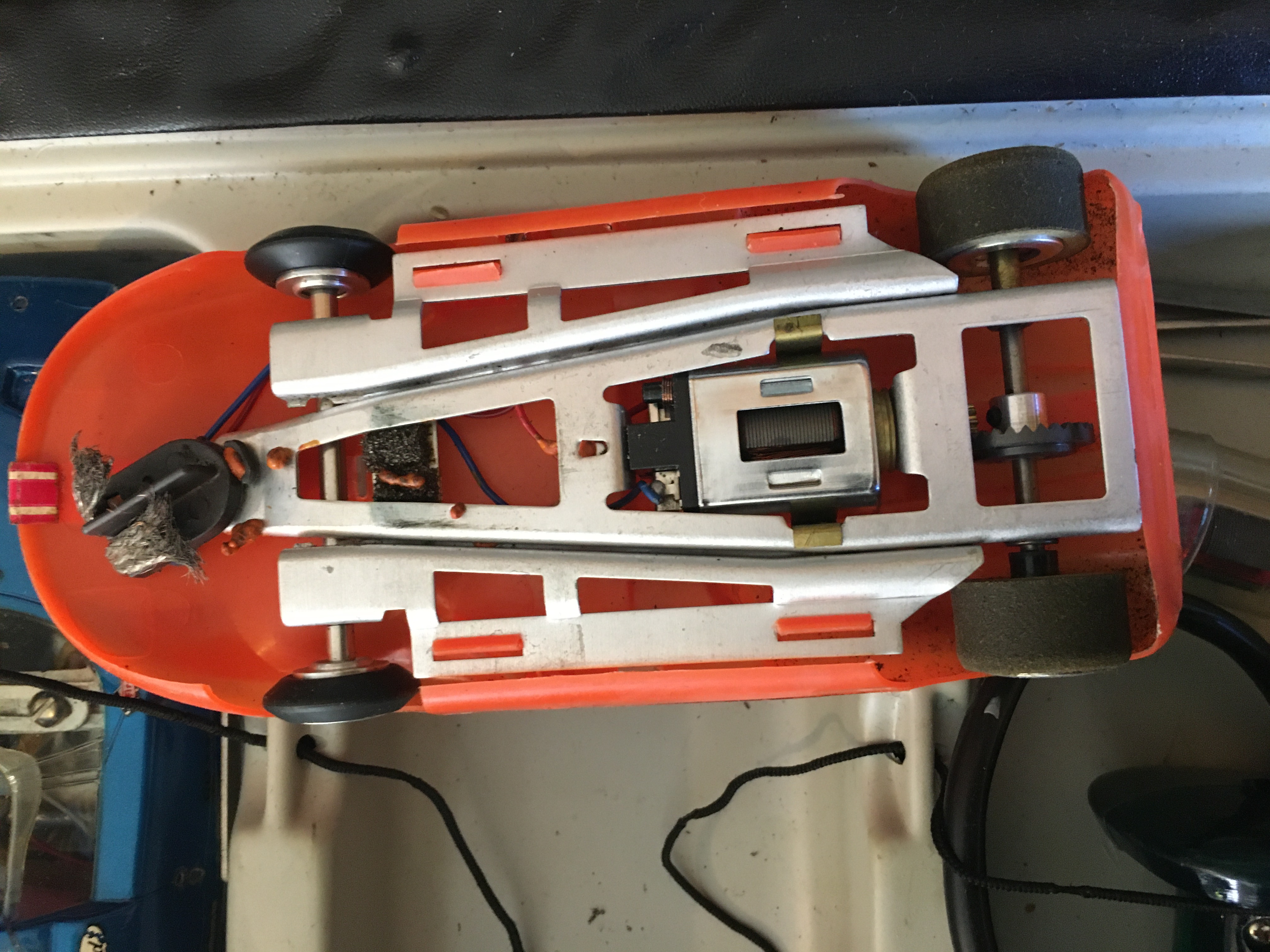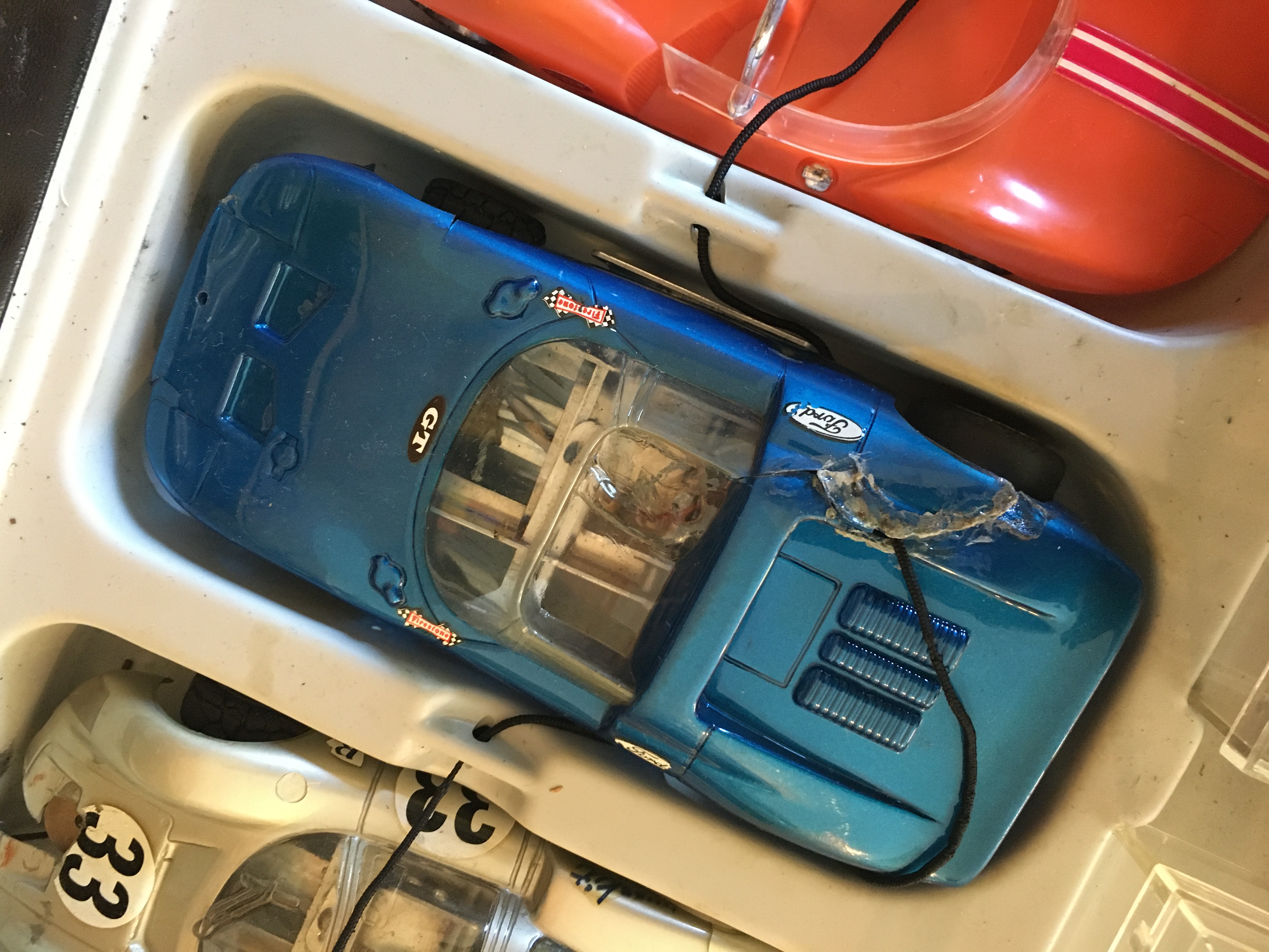 The orange car is a Cox La Cucaracha in very good shape (one recently sold in similar condition on feebay for $270). The silver Champion is a Porsche 906, the blue one is a Ford GT40 Roadster, both with some body damage, but the chassis are in good shape, though some of their tires will need to be replaced. The controller is an MRC. None of these cars have been tested and have been in storage for a long time.