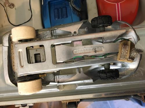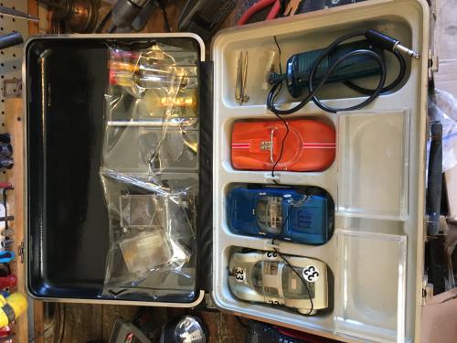 The orange car is a Cox La Cucaracha in very good shape (one recently sold in similar condition on feebay for $270). The silver Champion is a Porsche 906, the blue one is a Ford GT40 Roadster, both with some body damage, but the chassis are in good shape, though some of their tires will need to be replaced. The controller is an MRC. None of these cars have been tested and have been in storage for a long time.