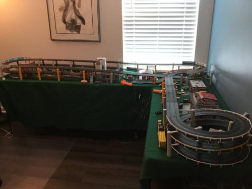 So here is my 1:64 T-jet AFX track from 1970. It is 738 inches on the inside lane, and 743 inches on the outside lane. I run 20 Magnatraction AFX cars, and 20 Tyco Turbo cars in my races. I also have 2 magnatraction Semi Trucks, and and 2 Magnatraction chassis with lights for the Police, and Fire Chief. cars.