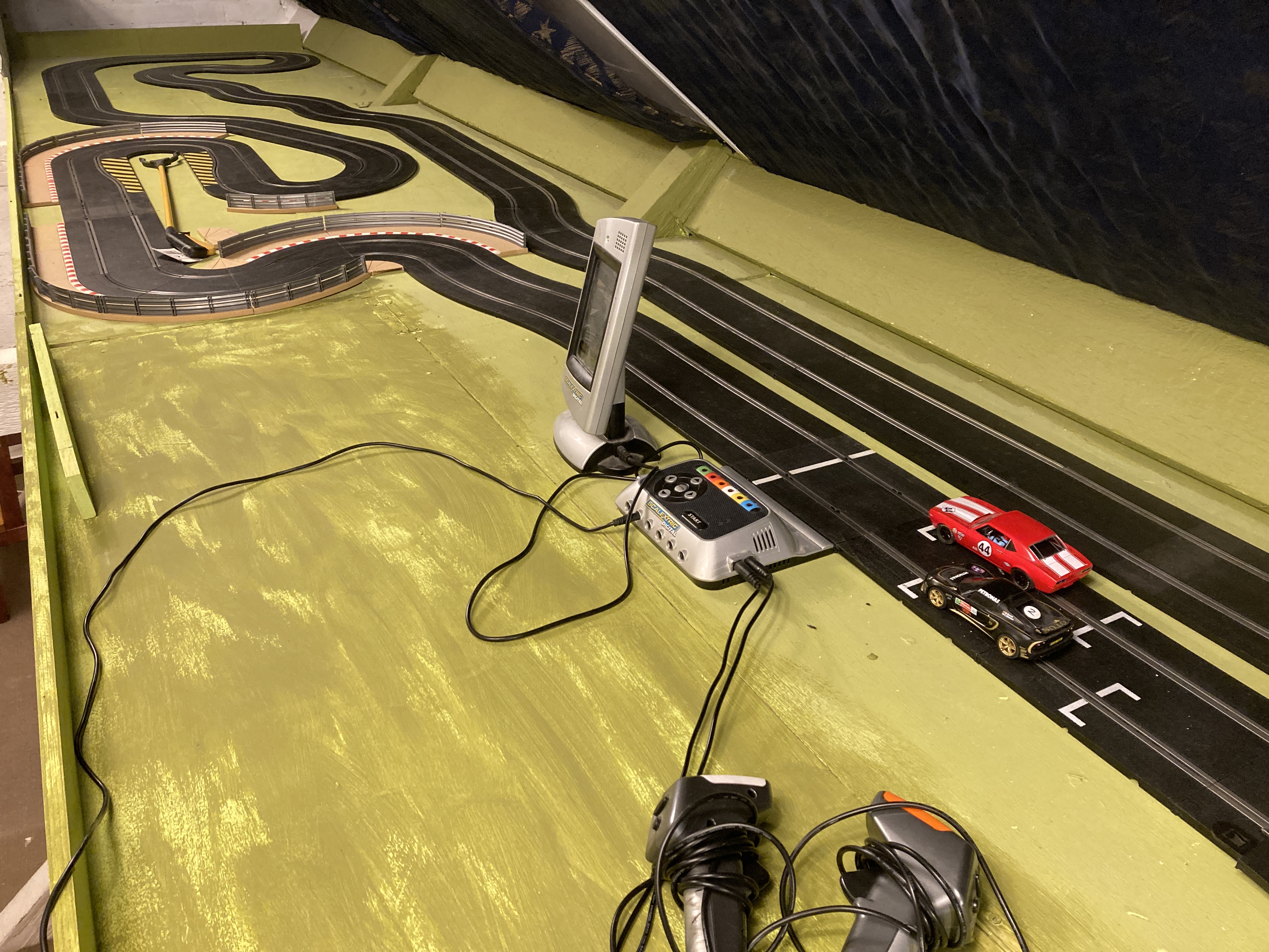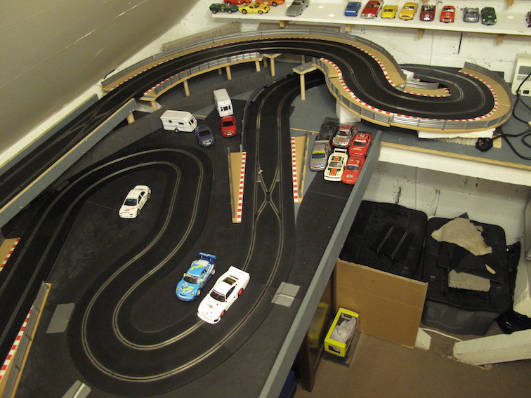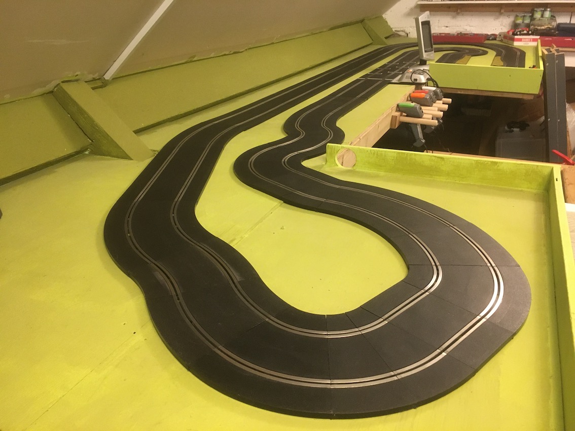 Before I tried to find all the bits to make these tracks I built up a simple track with whatever pieces came to hand from the boxes on the top of the pile, just to have something up for a bit of fun. I’m using one end of the track surface that goes around the loft hatch, so it’s a smaller track, at least for the time being. After not using the APB for the best part of a year, I couldn’t even get it to start up in the right mode or change it from digital to analogue without having to dig through several boxes of slot stuff to find the manual and have to read it through. Again, another element of digital slot racing that’s a big turn off. My PS4 doesn’t need a forum-user generated manual before I can work out how to get it to play games. Slot car system manufacturers have a lot to learn about accessibility and user interaction. Oops, moaning again!