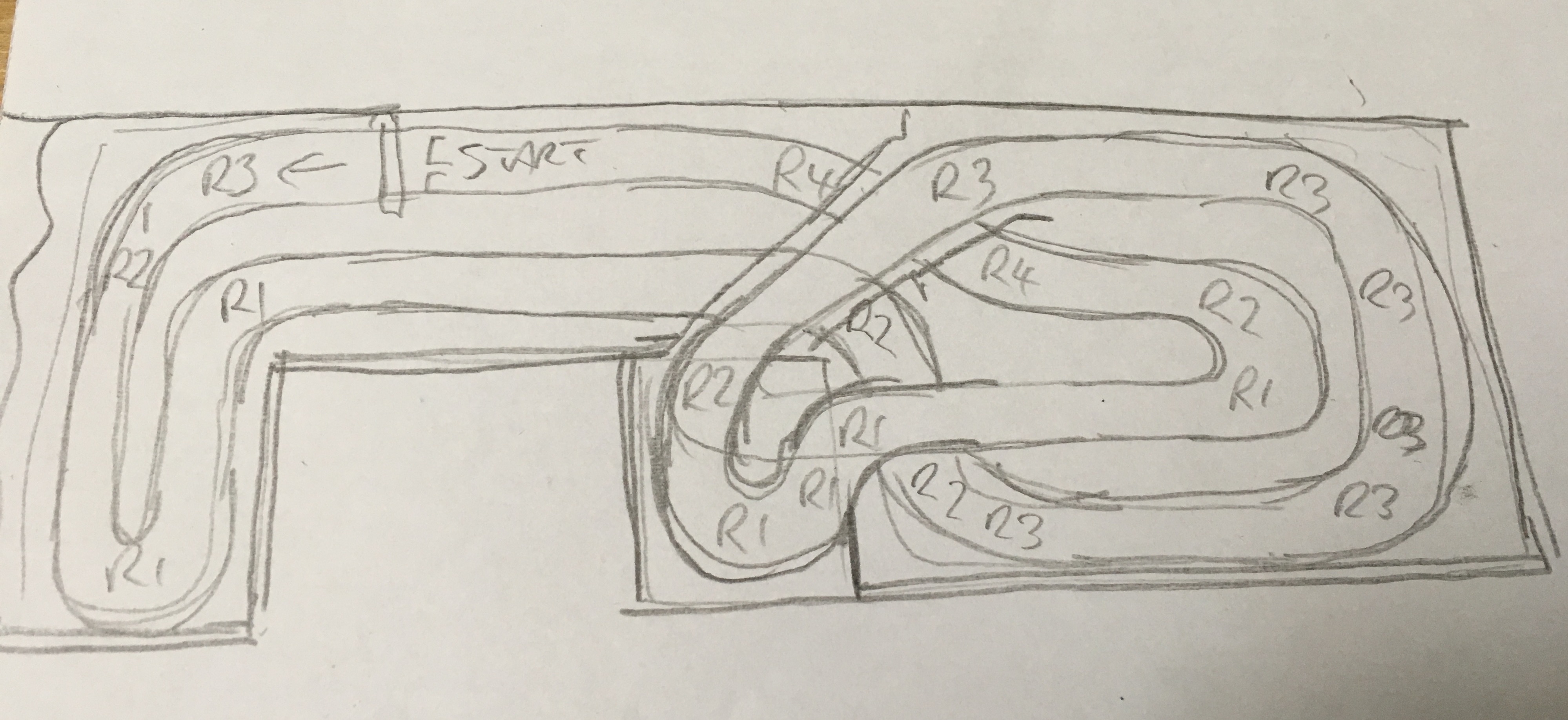 I thought I’d have a fiddle with a track designer app to see if I could get it to fit into my board dimensions but on a Mac there’s not much available. I had a go with Railmodeller express and it was nice and easy to use but the free version limited the track to 50 elements so could only do a basic track. I managed a version of the doodle above and I had a go at another more elaborate track I’d like to try: