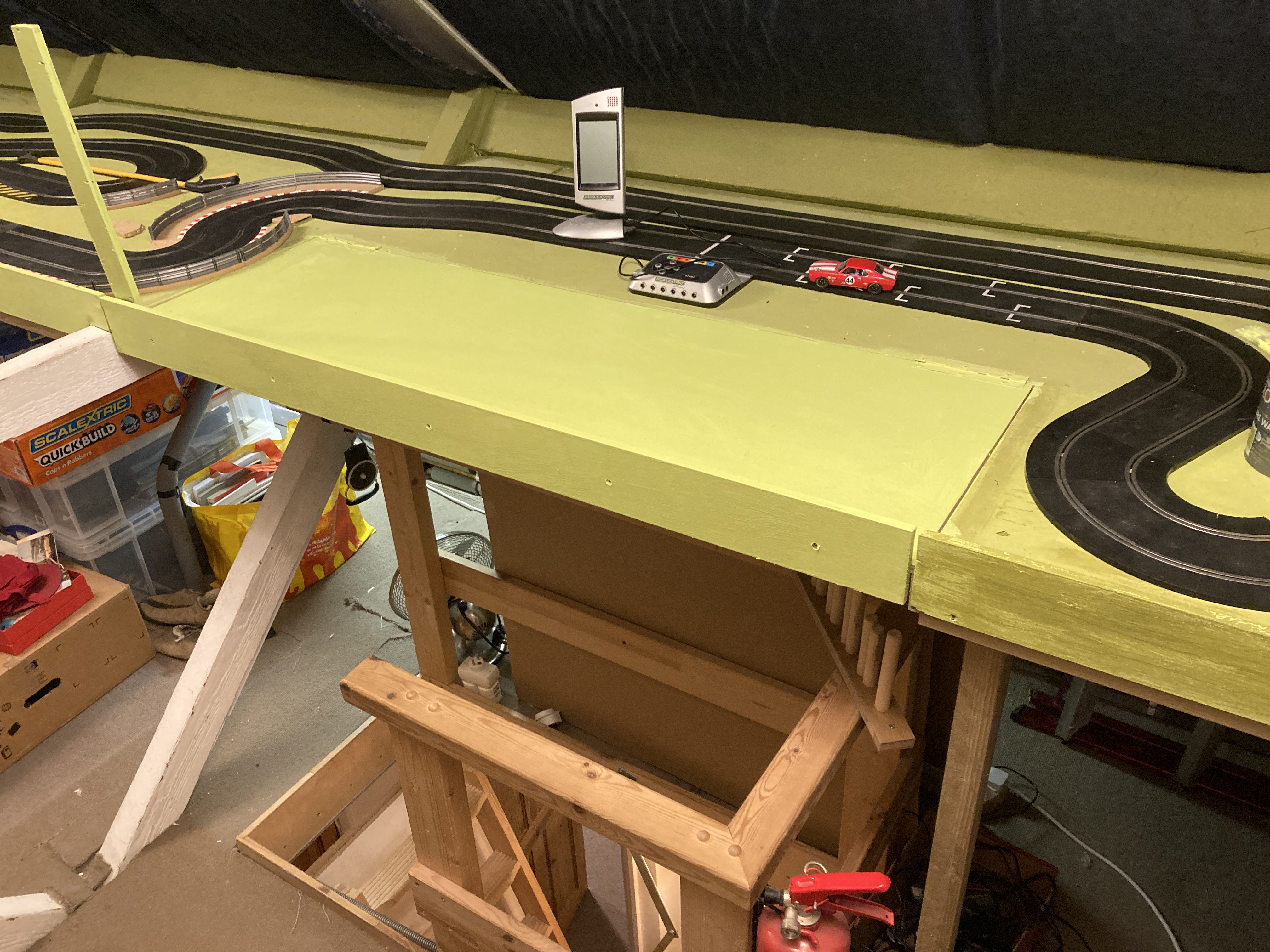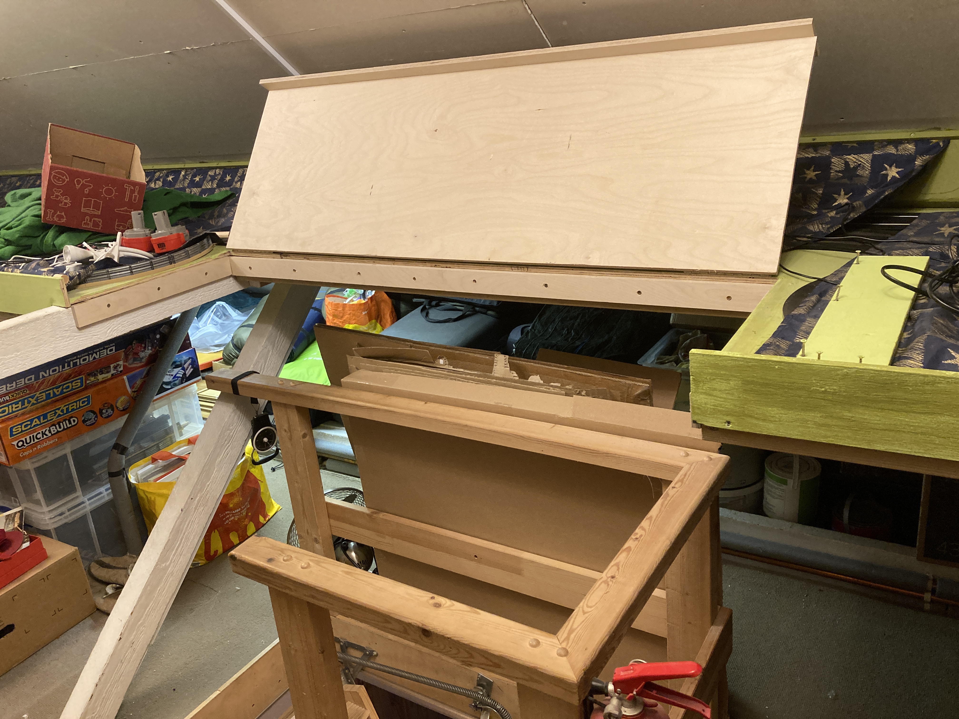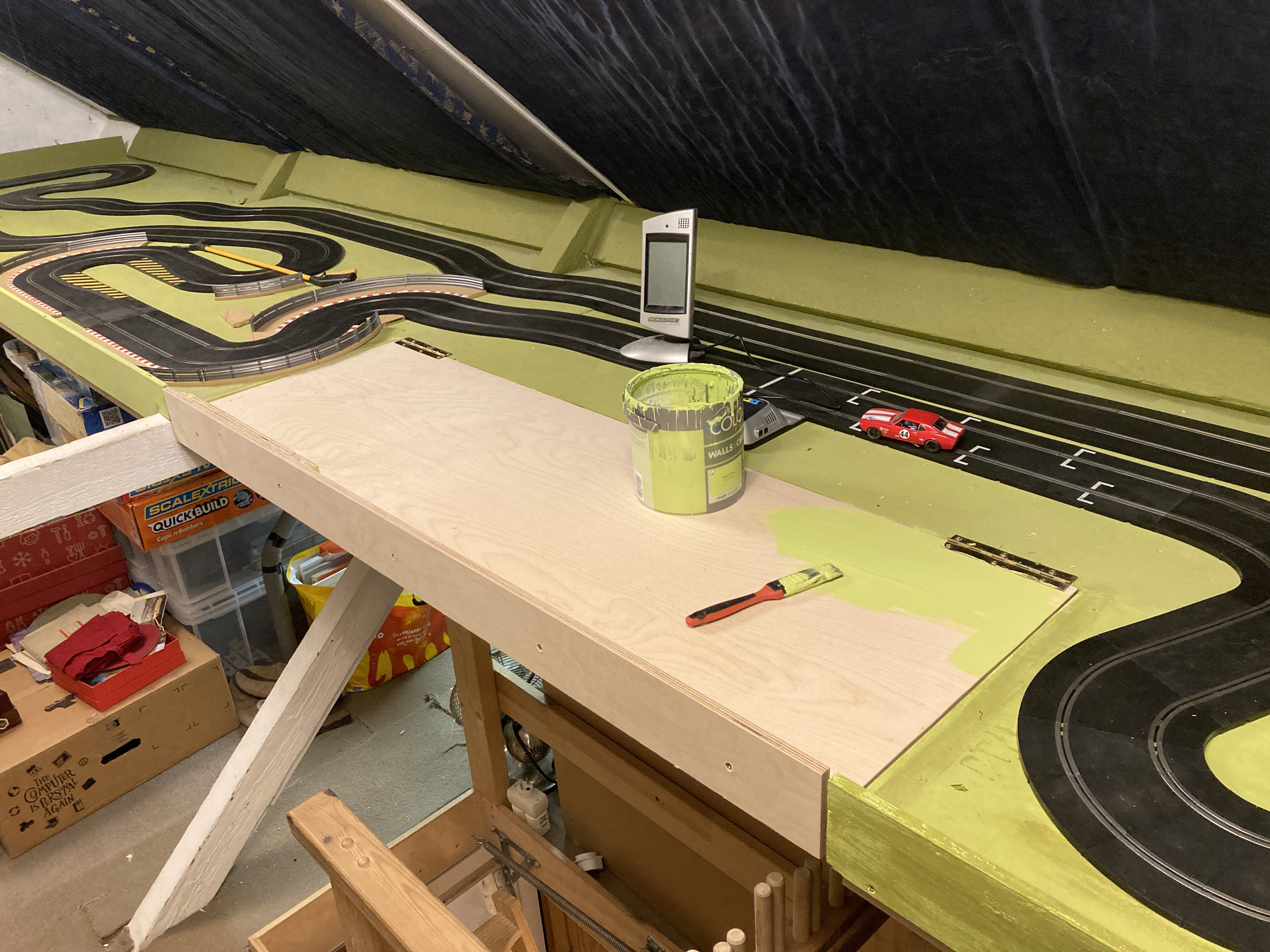 Anyway, this is supposed to be about the track, not my cars. I did the thing I probably should have done with my track table right from the start of the 'Beyond The Loft Hatch' thread over on the other place years ago and added a folding flap above the loft hatch entrance to remove the narrow pinch in the middle of the table, but also allow access into the loft for big stuff when necessary.