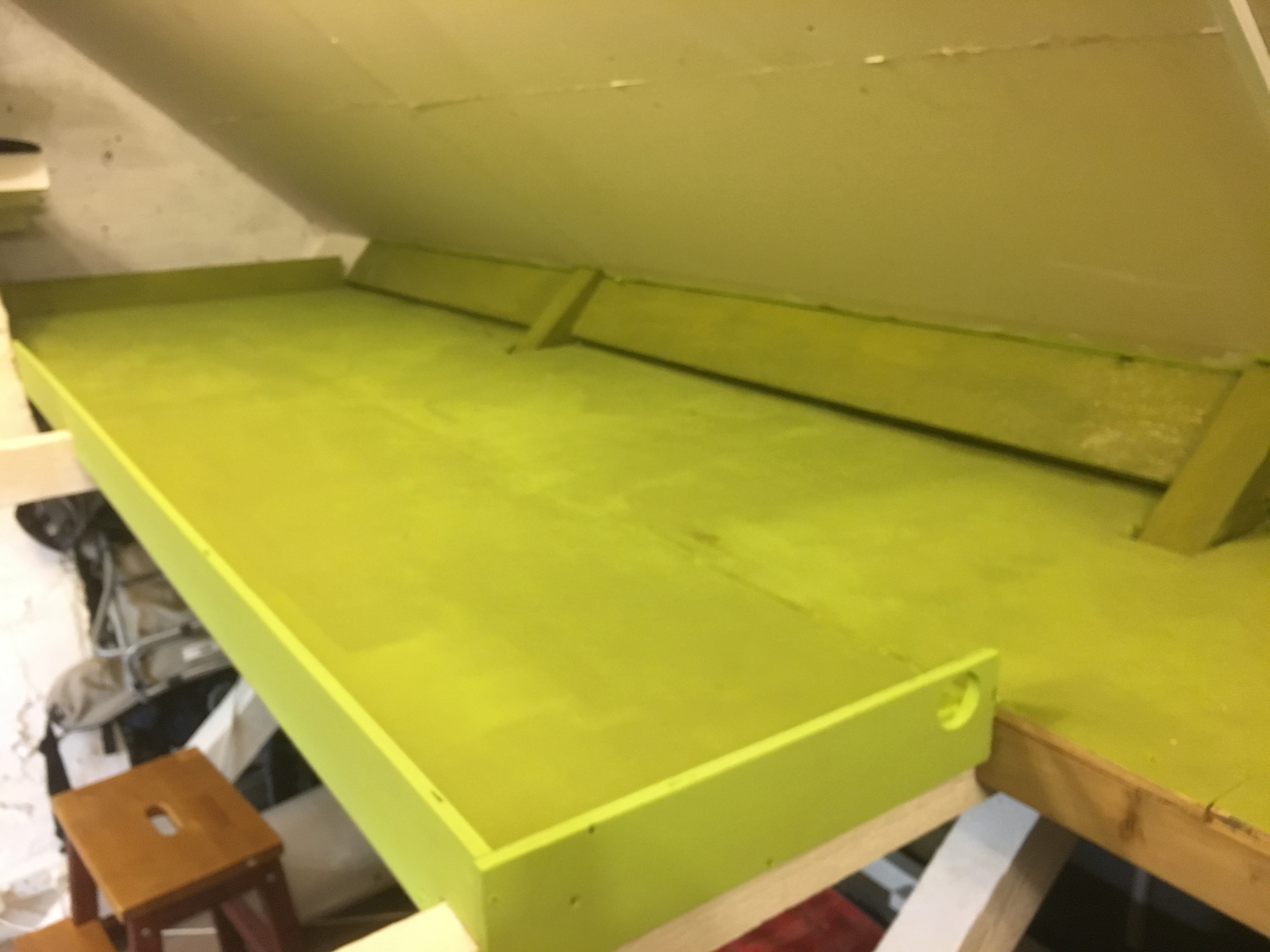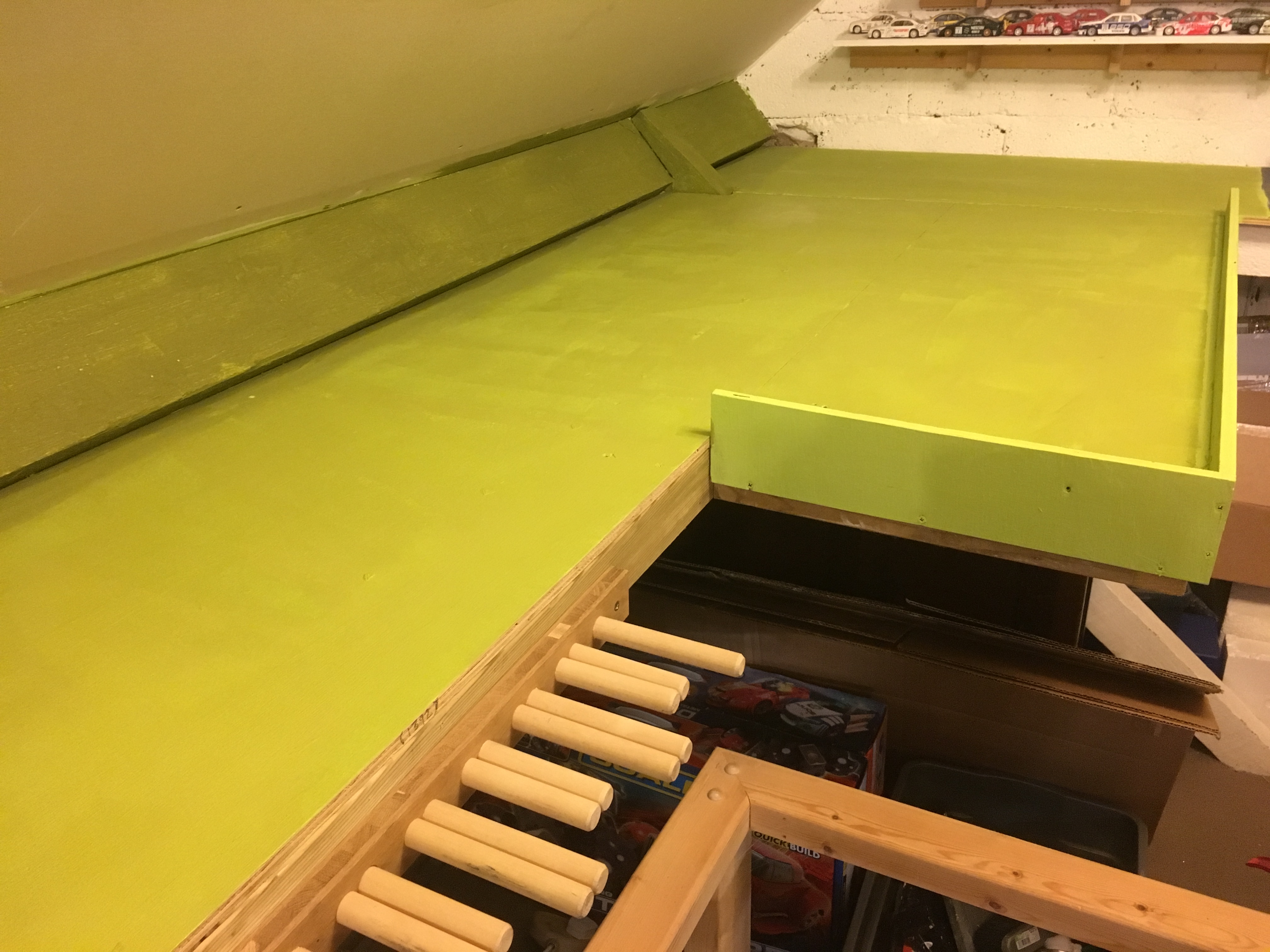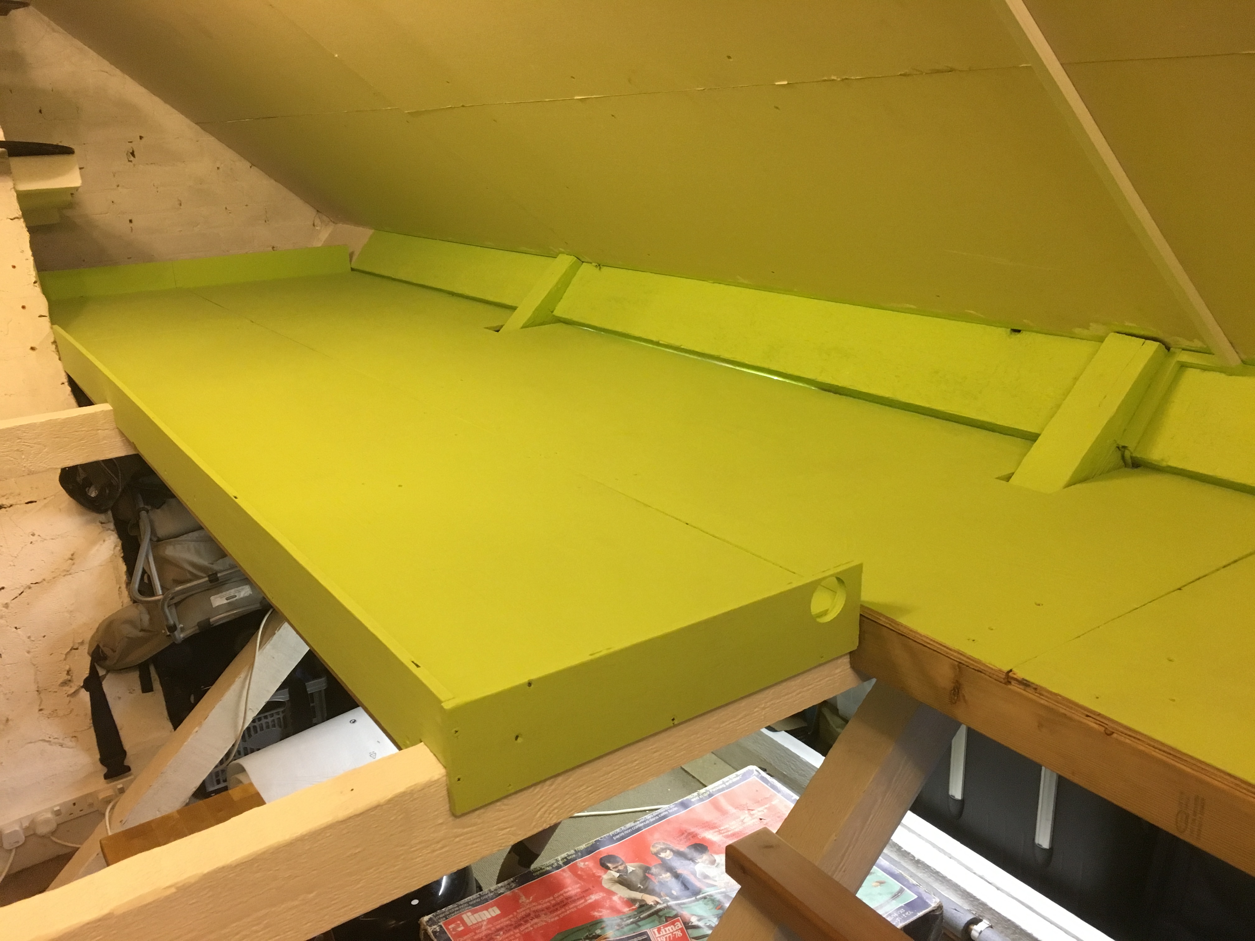 Anyway, this is supposed to be about the track, not my cars. I did the thing I probably should have done with my track table right from the start of the 'Beyond The Loft Hatch' thread over on the other place years ago and added a folding flap above the loft hatch entrance to remove the narrow pinch in the middle of the table, but also allow access into the loft for big stuff when necessary.